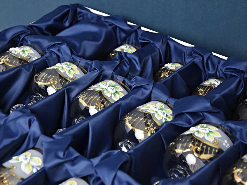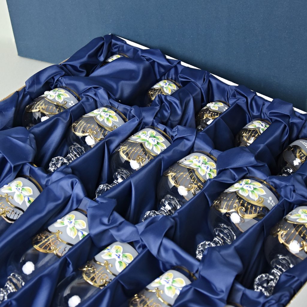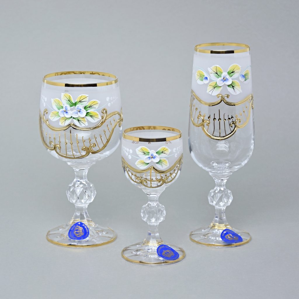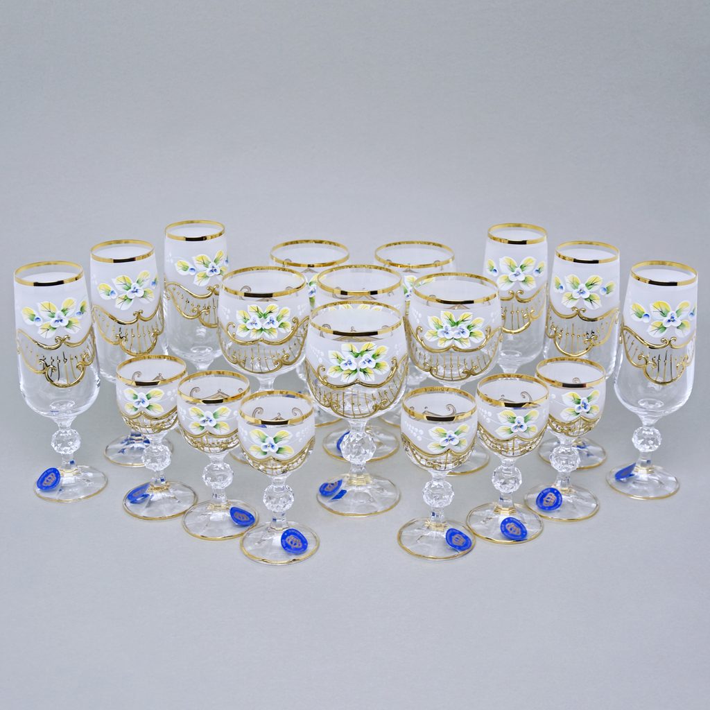Sada 18 ks. 3 druhů kvalitních jednolitých sklenička z Crystalexu Nový Bor. Bezolovnaté křišťálové sklo dekorované firmou Novoborské sklo smaltovanými kvítky a zlatem.