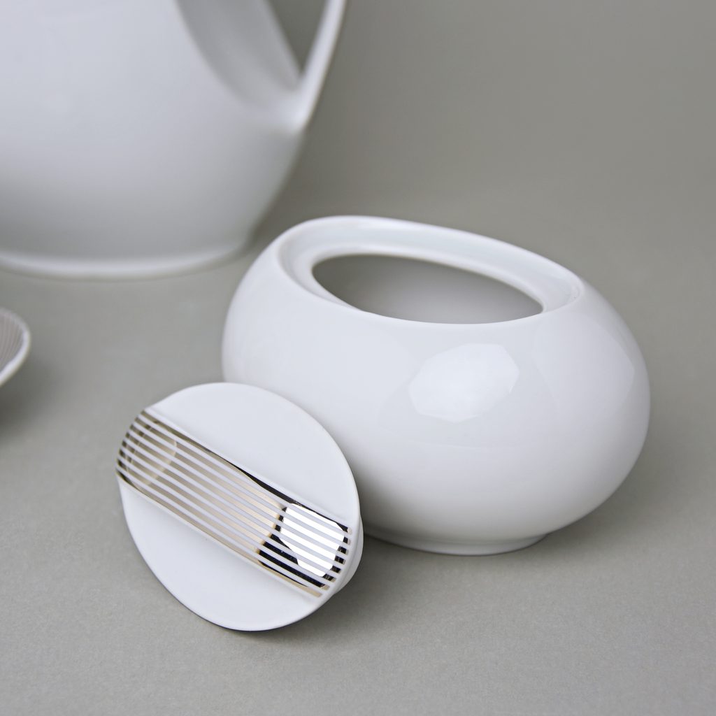 OVÁLNÝ porcelánový tvar Loos, inspirovaný legendárním brněnským rodákem Adolfem Loosem, klasikem moderní architektury. Skvělá užitná i estetická hodnota porcelánu Loos. 6x šálek 140 ml a podšálek, cukřenka 200 ml, mlékovka 150 ml, konev káva 1,3 l, platinový dekor