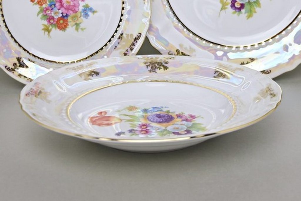 Nádherný bohatě zdobený tradiční dekor s perletí, zlatem a kvěinami. Kvalitní porcelán Leander. 3 druhy květin v dekoru - jeden dekor vždy po dvou talířích v každém provedení viz. foto.