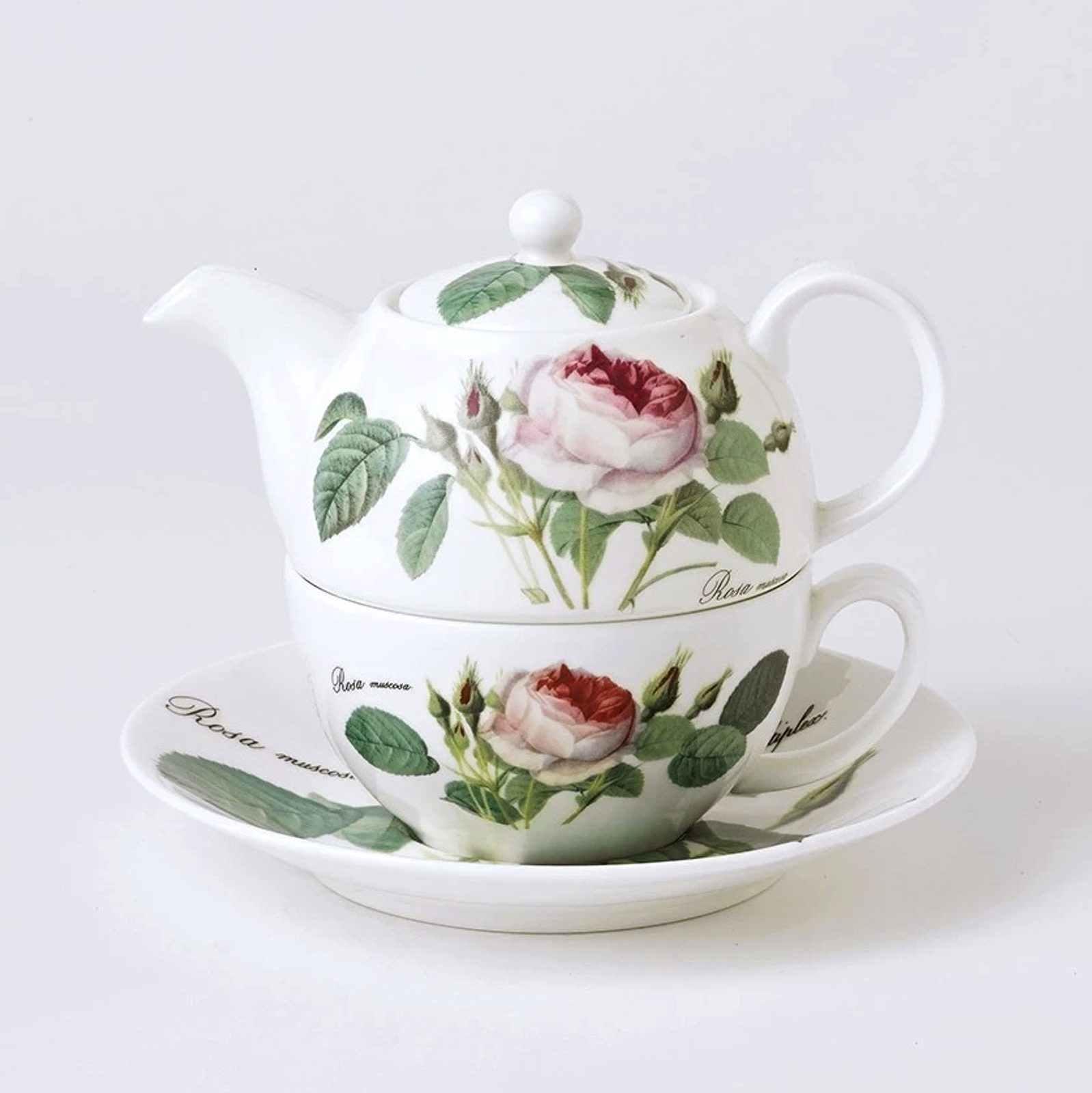 Redoute Rose: Čajová sada 3díl., Tea for one set, anglický kostní porcelán Roy Kirkham