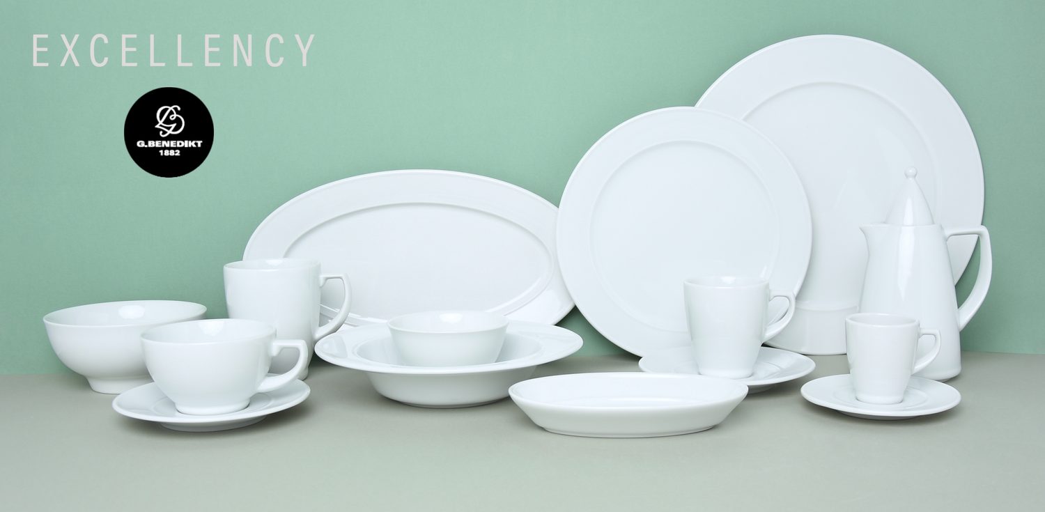 Excellency je elegantní, hravá, ale za každé situace skrznaskrz praktická kolekce. Kvalitní nádobí z porcelánky G. Benedikt (Karlovy Vary).