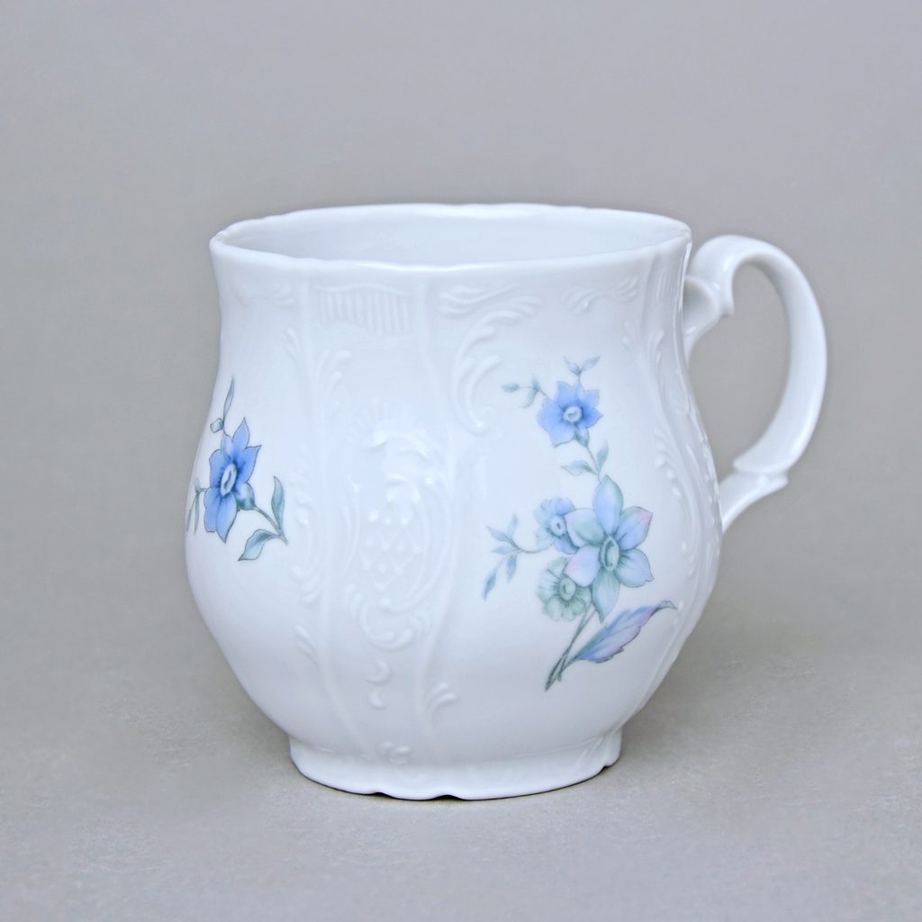 Tradiční lehký hrnek Jonáš tvaru Bernadotte od naší momentálně nejstarší fungující porcelánky Thun 1794. Dekor č. 68400 - modré květy hořce.