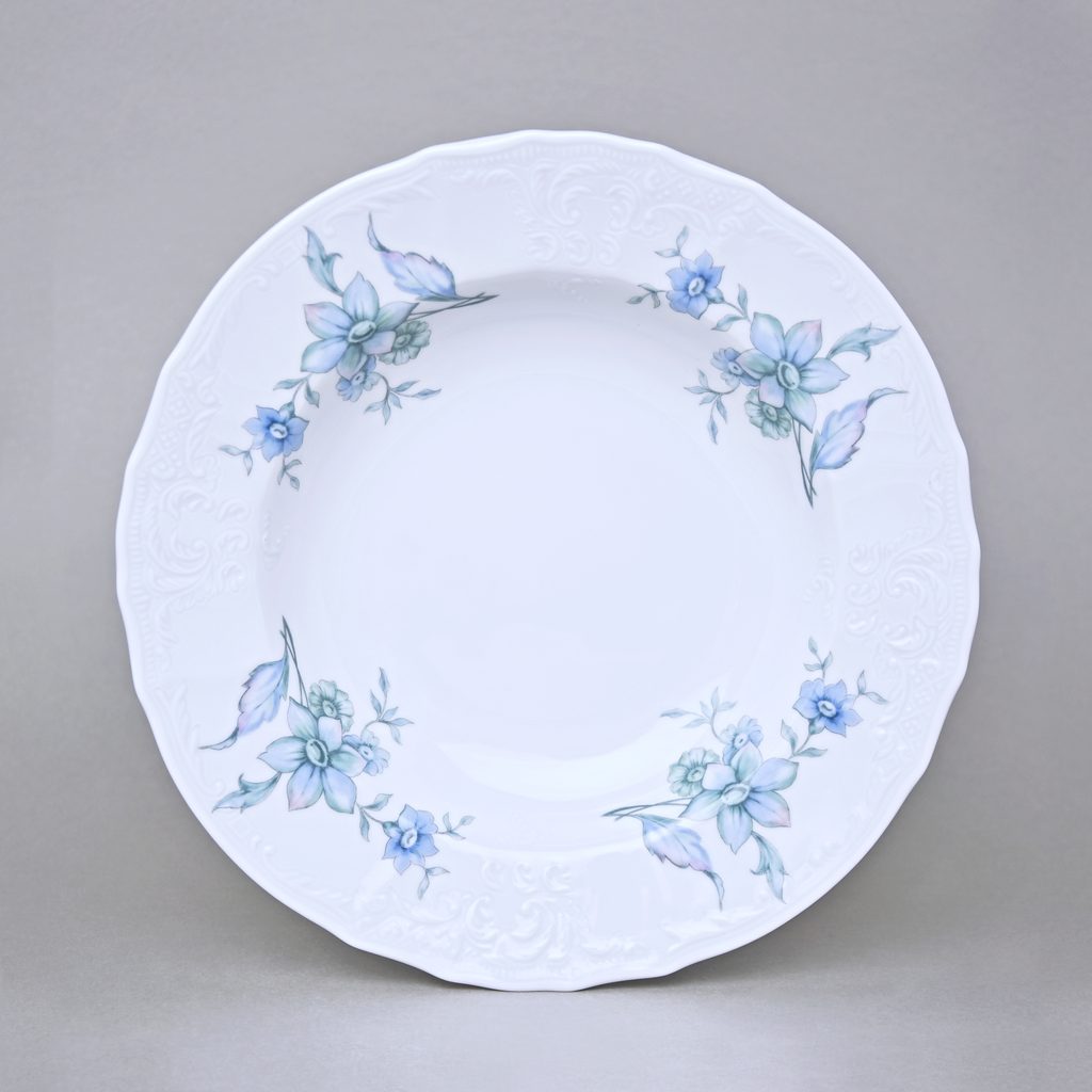 Klasický talíř na polévku o průměru 23 cm. Dekor č. 68400 - modré květy hořce na porcelánu Bernadotte, Thun 1794.