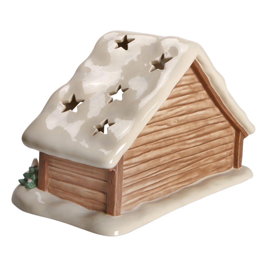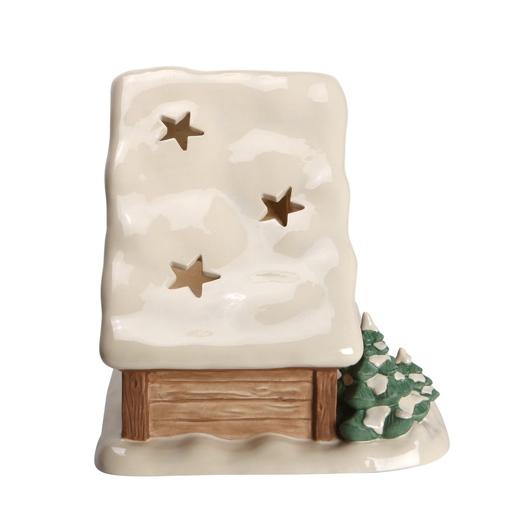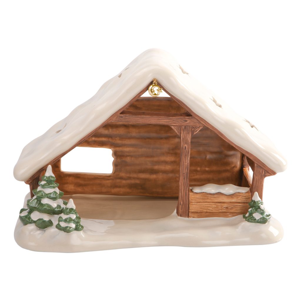 Zasněžená betlémská salaš (vč. jedné svíčky) pro soubor kameninových figurek Narození ježíška, který nedávno uvedla porcelánka Goebel na trh. Salaš při zapálené čajové svíčce okouzlí přítmí vašeho vánočního obýváku.