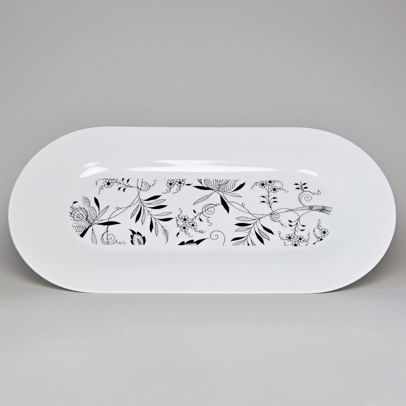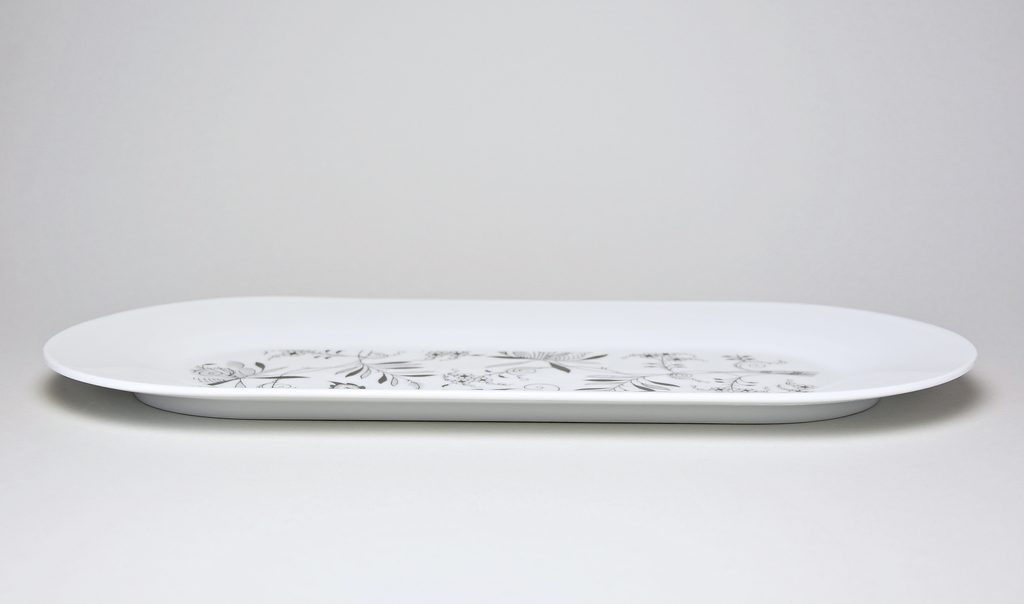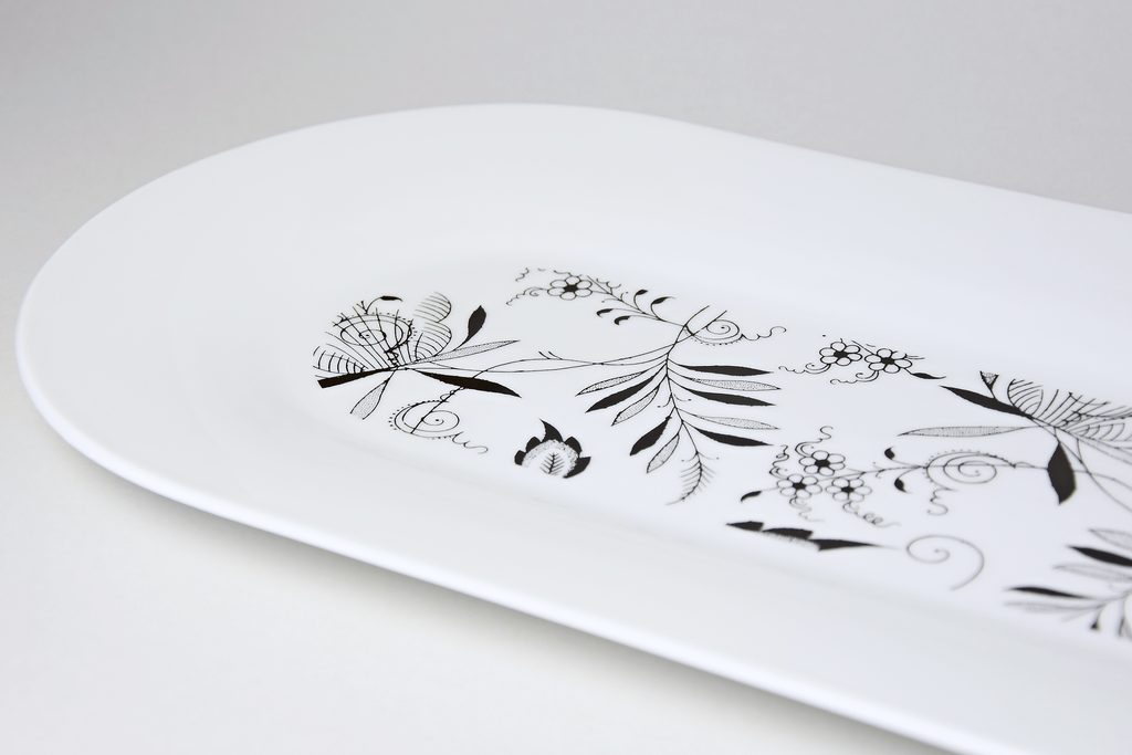 Oválný podnos / tác z kolekce navrhované známým designérem a architektem Jiřím Pelclem. Zjednodušený cibulákový dekor v černé barvě na designovém porcelánu. Krásný doplňěk do moderní domácnosti. Výrobek z jemného porcelánu z tradiční české porcelánky v Dubí.