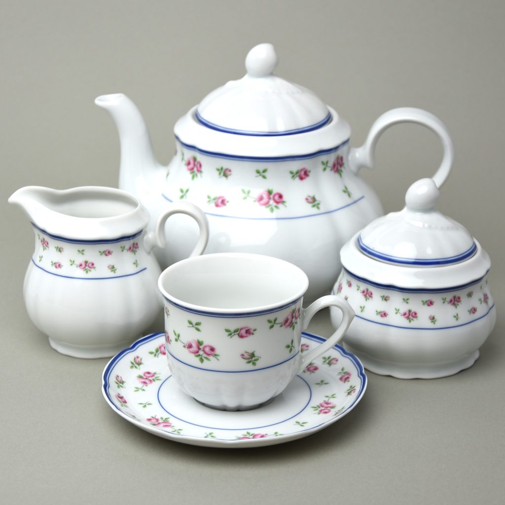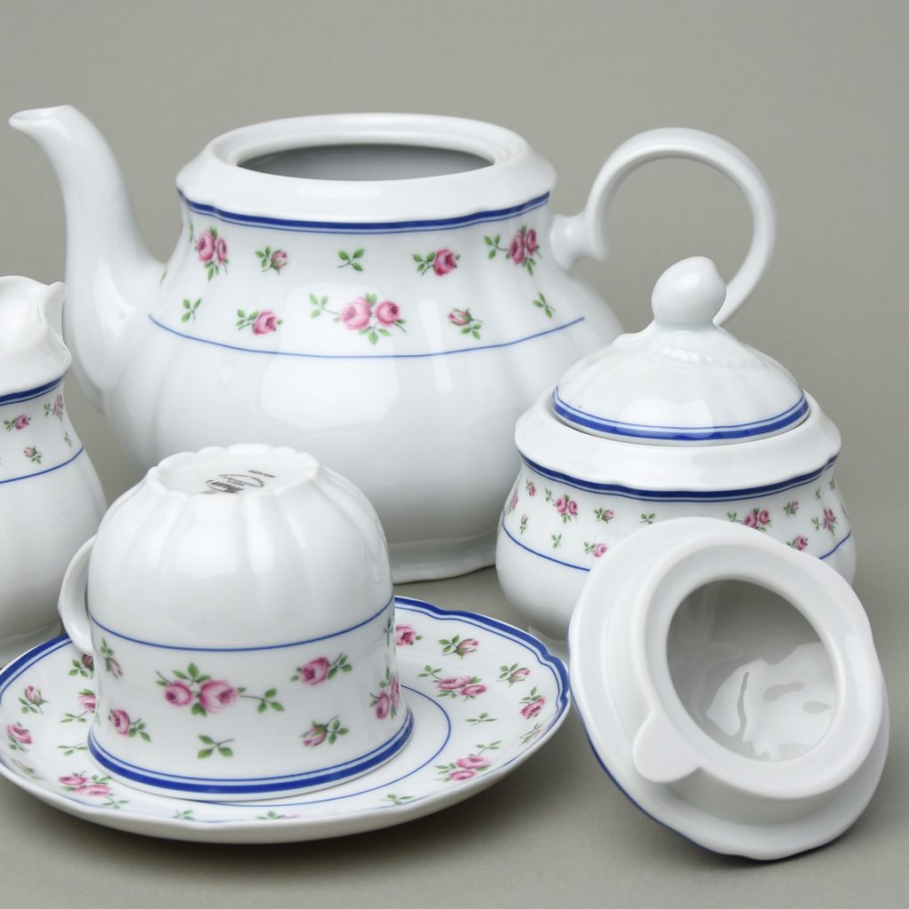 6x šálek 200 ml (v. 71 mm, pr. 82 mm), cukřenka 250 ml, mlékovka 250 ml, konev čajová 1,2 l, tradiční RŮŽIČKOVÝ glazurovaný DEKOR na porcelánu tvar Rose