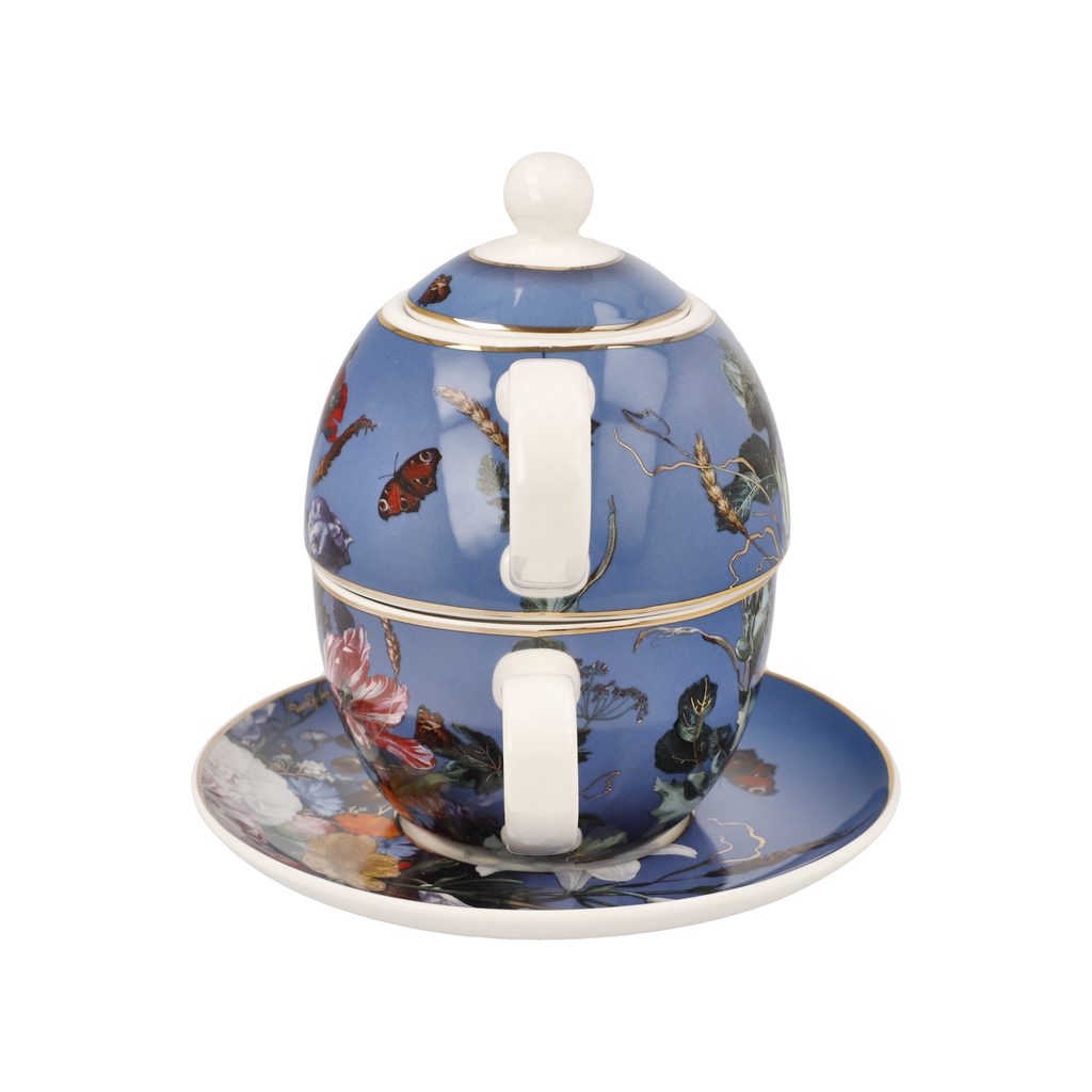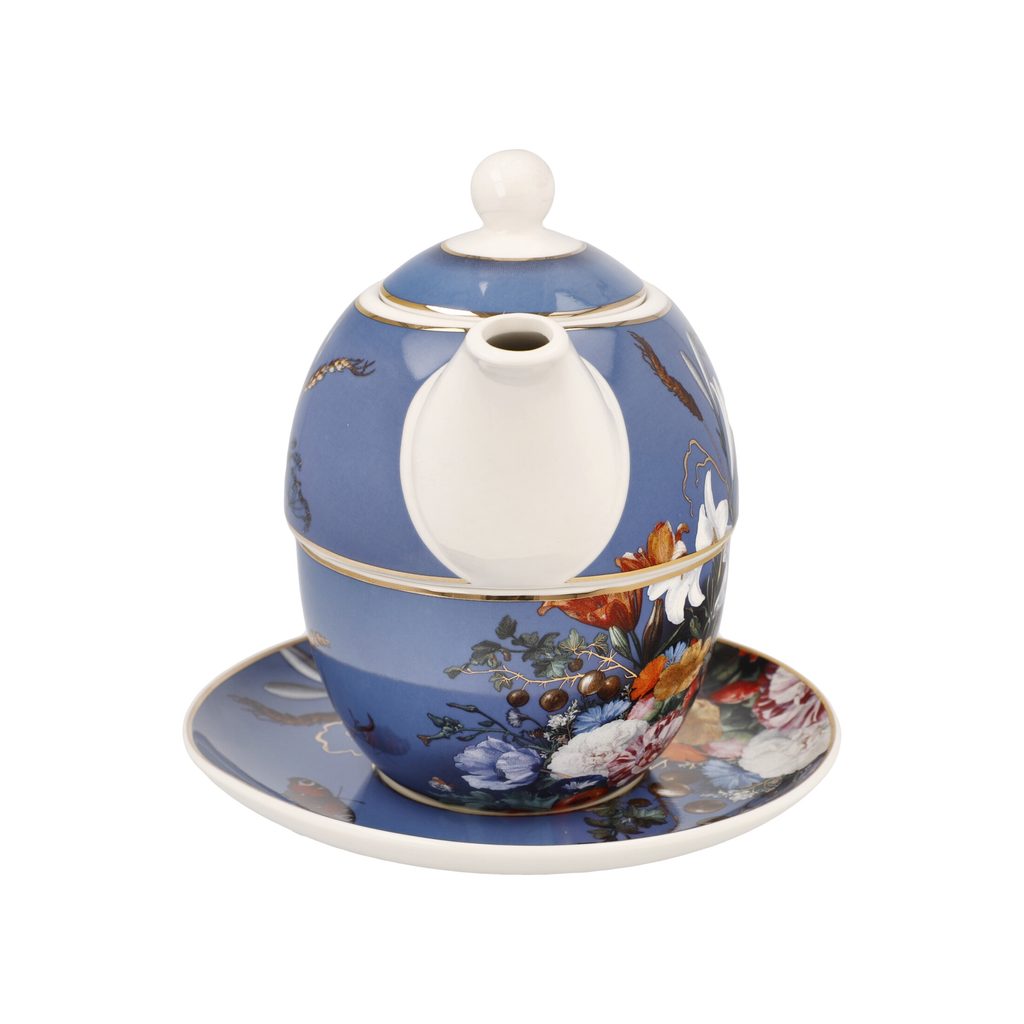 Podšálek 15,5 cm, šálek 250 ml, konvička 350 ml (zapadá při skaldování do šálku), nový kostní porcelán, květinový motiv Letní kytice od slavného nizozemského mistra Jana Davidsz de Heema, který se specializoval na květinovou malbu