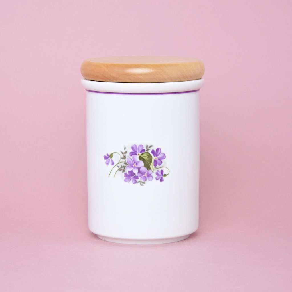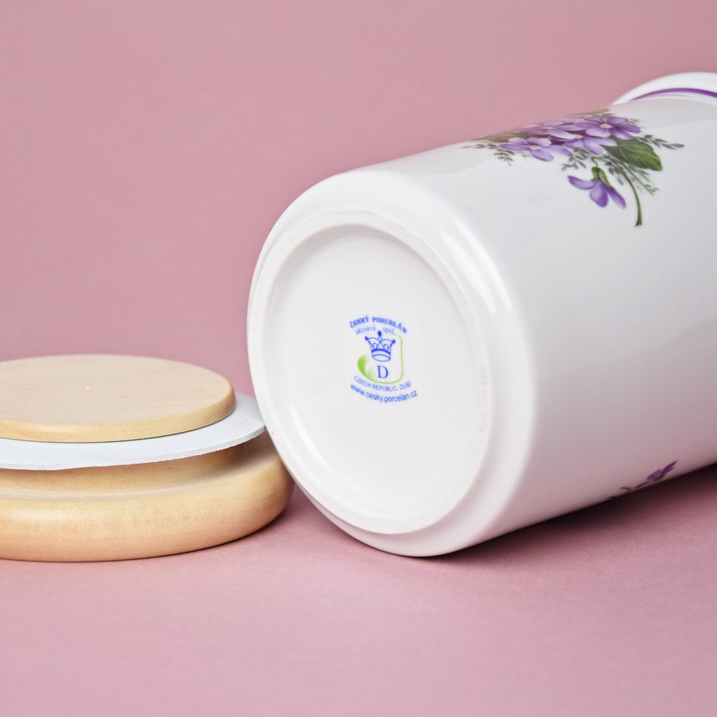 Dóza s dřevěným uzávěrem C - velká 12,5 x 9,7 cm, fialky, Český porcelán a.s.