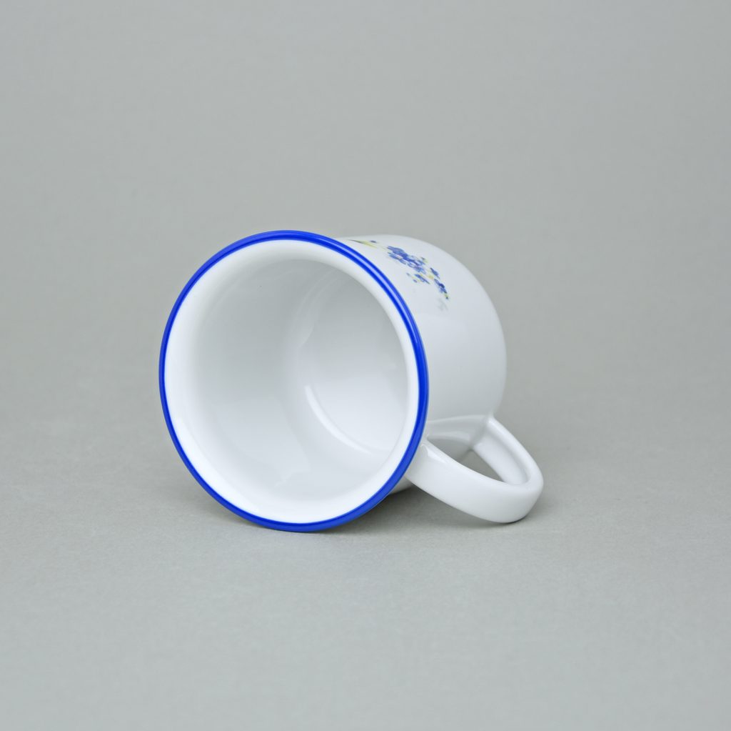 Krásný porcelánový "plecháček" s oblíbeným dekorem pomněnky. Hrnek na vaší ranní kávu, kakao, či čaj v retro stylu. Výrobek tradiční české porcelánky v Dubí - Český porcelán, a.s.