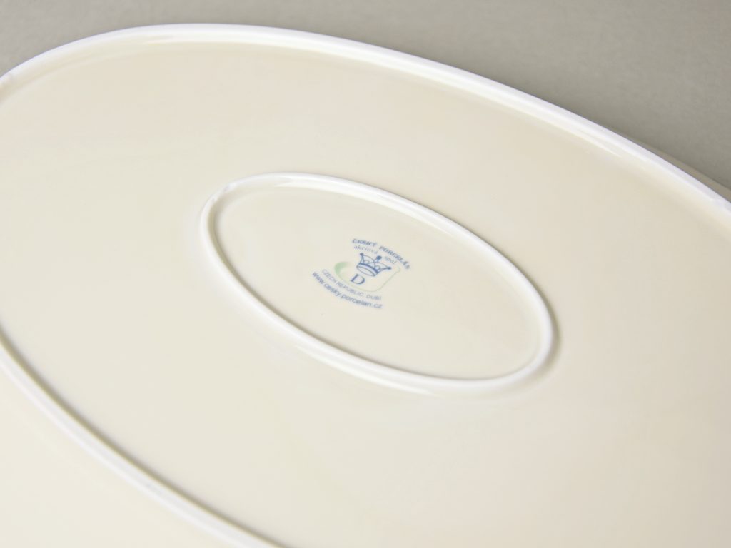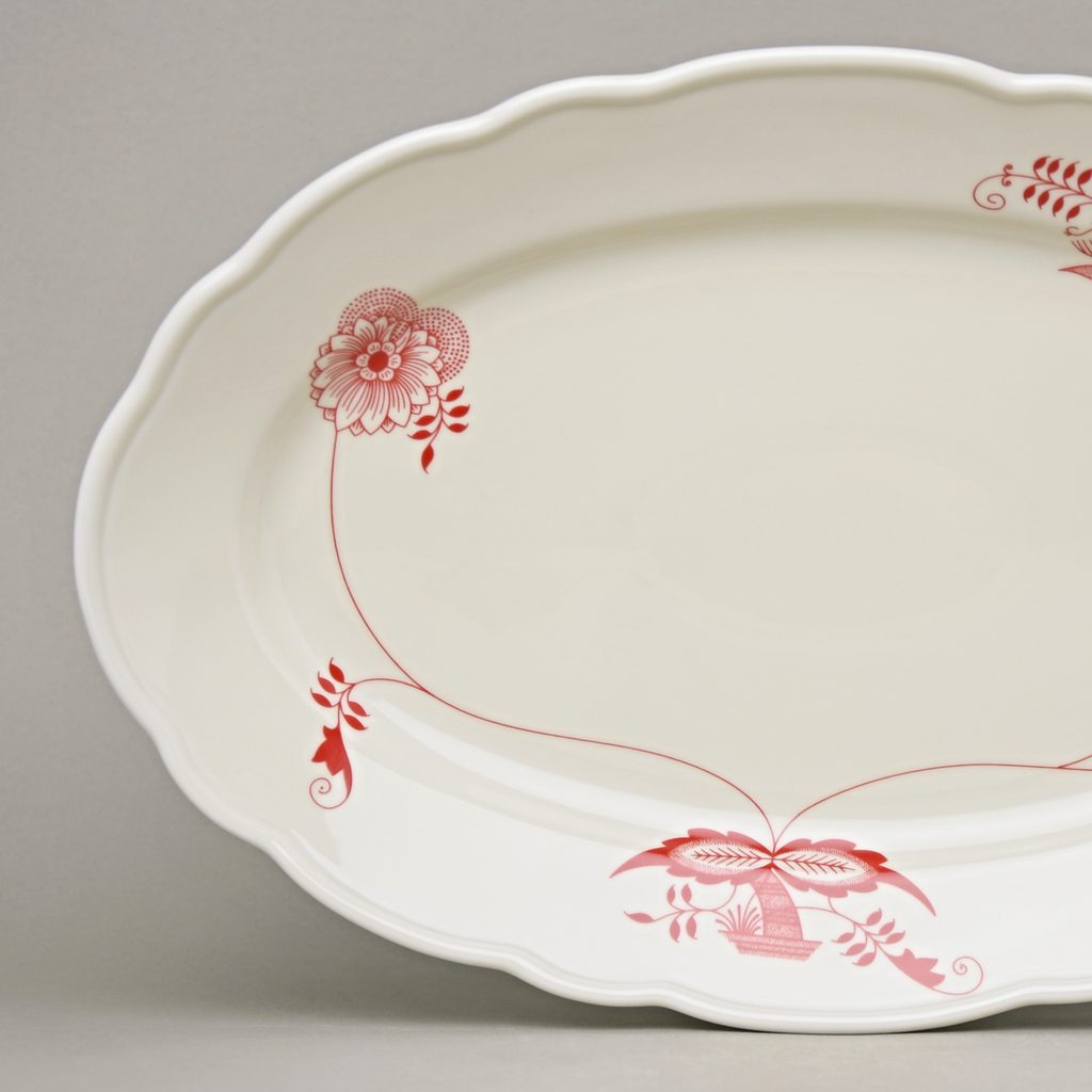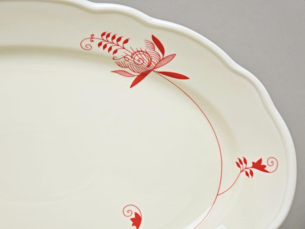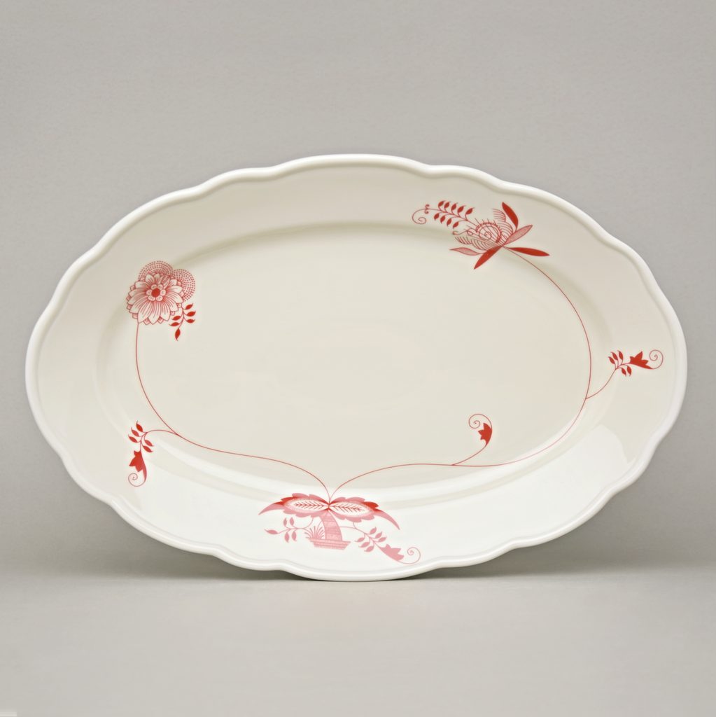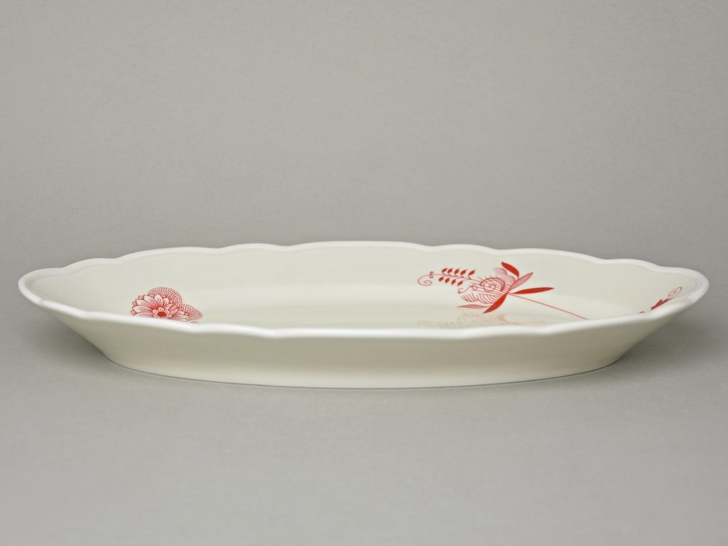 Mísa mělká oválná 35 cm. Červený dekor zjednodušeného cibuláku "ECO" na porcelánu v barvě slonové kosti. Vyrábí Český porcelán a.s. v Dubí.