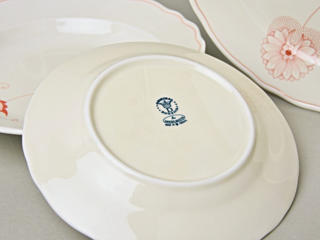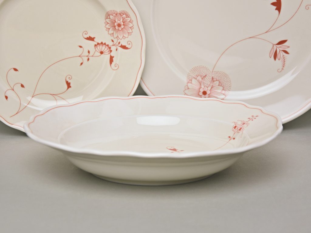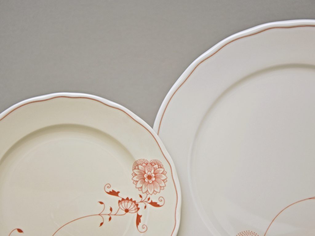 Zjednodušený cibulákový VTAVENÝ (GLAZUROVANÝ) červený dekor "ECO" na porcelánu v barvě slonové kosti. Vyrábí Český porcelán a.s. v Dubí.