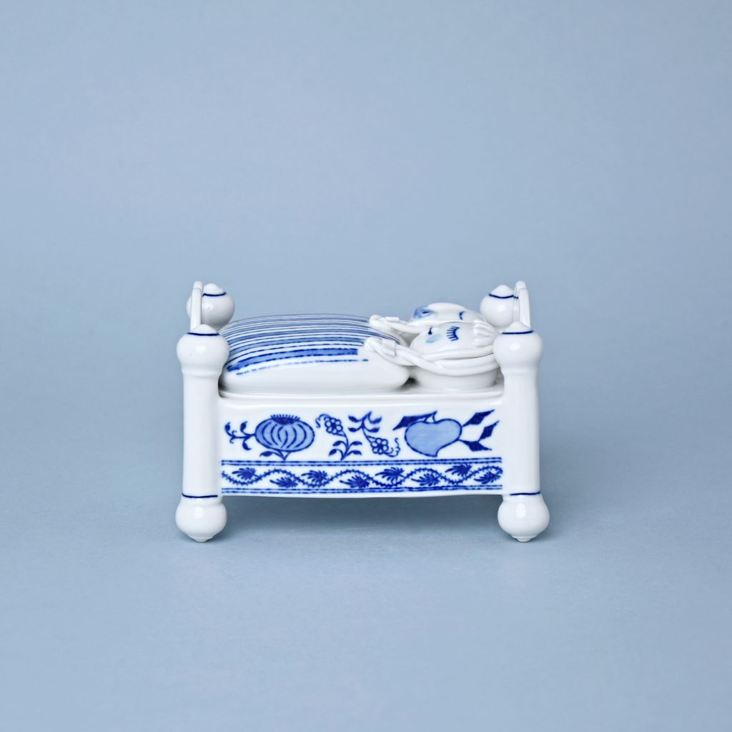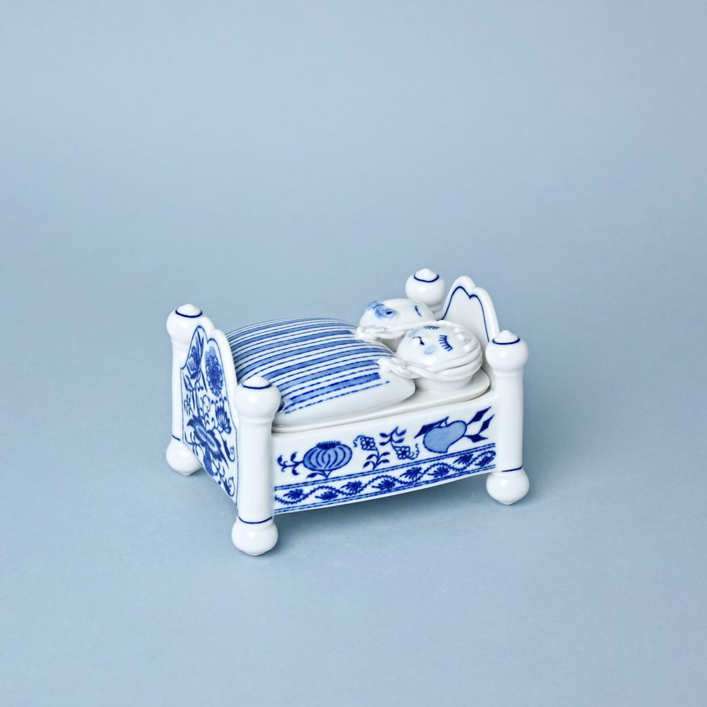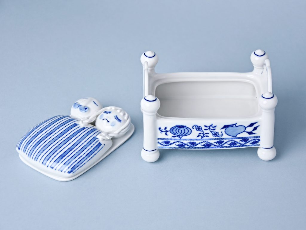 Dvoudílná dóza s víkem v podobě postýlky se spícím párem, kteří jsou víkem k otevírací dóze. Originální cibulák z Dubí, Český porcelán a.s. Rozkošná dekorace domů s tajným úložným prostorem na bonbóny či jiné drobnosti.