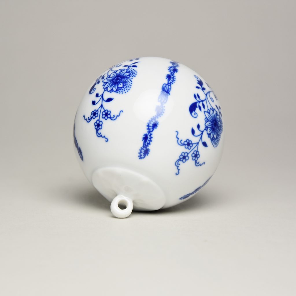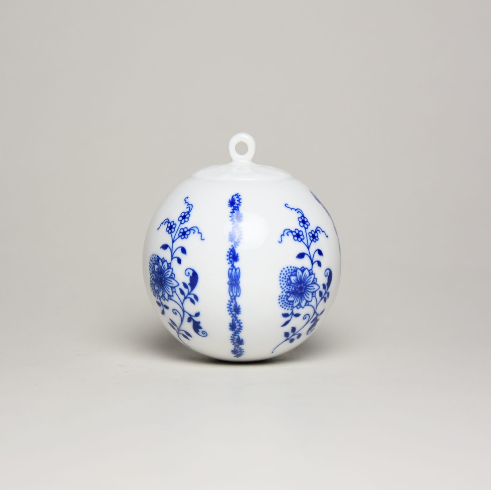 Porcelánová Vánoční ozdoba, kterou si můžete zavěsit nejen na stromeček. Koule - v cibulákovém dekoru. Z tradiční dílny Duchcov.