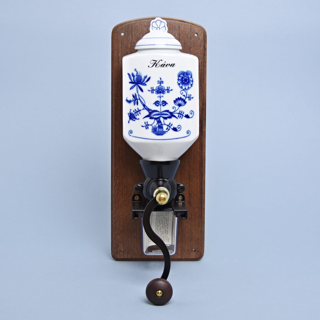 Porcelánový mlýnek na kávu s víčkem, vyroben v tradiční české porcelánce Český porcelán, a.s., v dekoru originální cibulový vzor. Dřevěné závěsné prkénko.