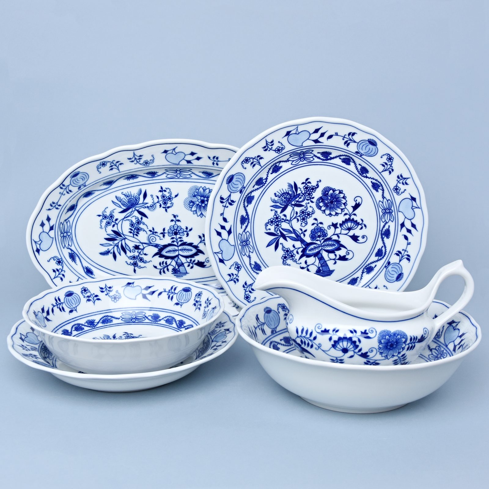 MODERNÍ složení soupravy, skvělý český výrobek, pravý cibulák z Dubí, UŠETŘÍTE! 6x talíř mělký 26 cm, 6x talíř hluboký 24 cm (též vhodný na velký salát), mísa hluboká kulatá 23 a 21 cm, mísa oválná 35 cm, omáčník 0,3 l