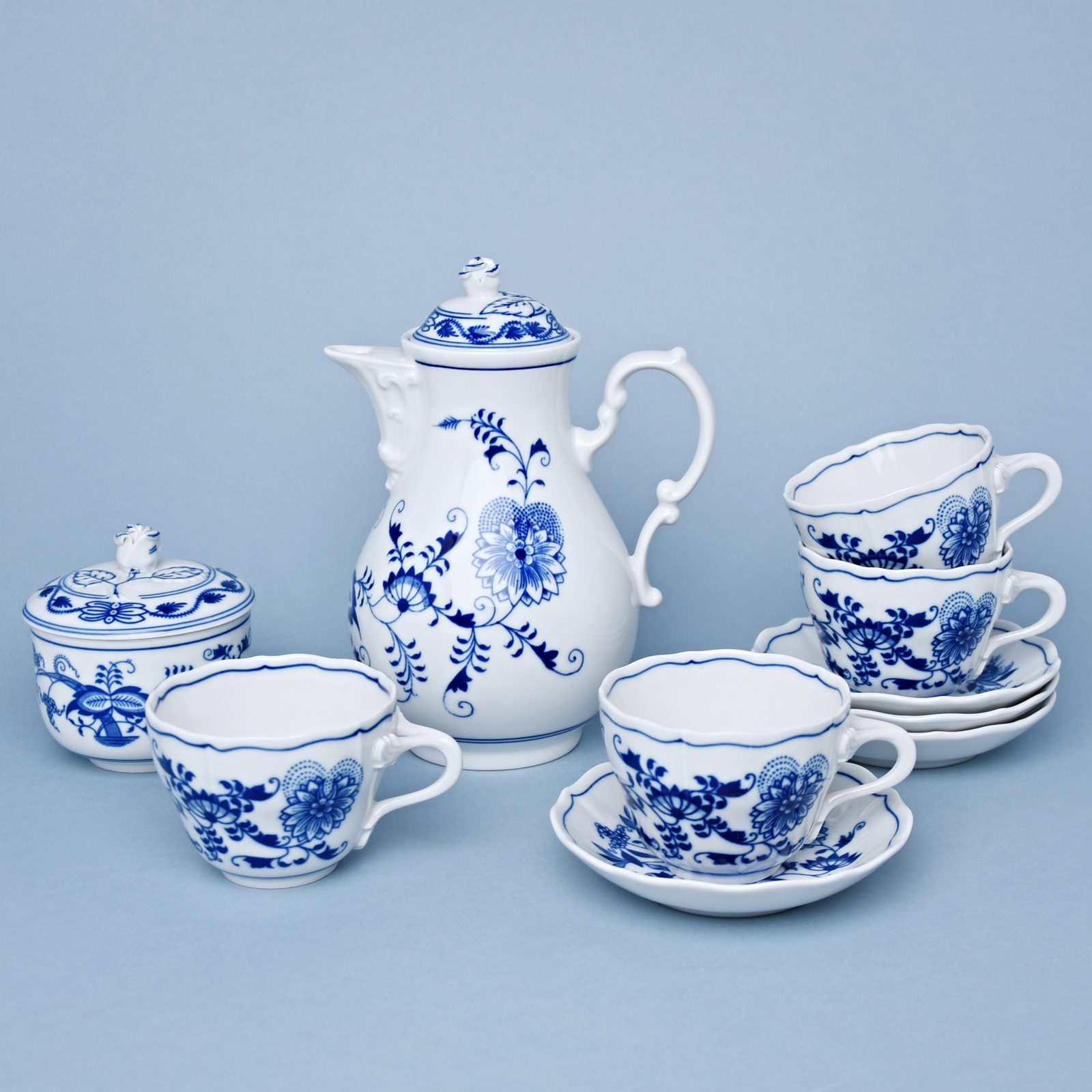 Krásná souprava pro 4 osoby. Originální cibulák z Dubí, Český porcelán a.s. Konev kávová 0,95 l plus 4x šálek a podšálek 0,175 l + cukřenka 200 ml.
