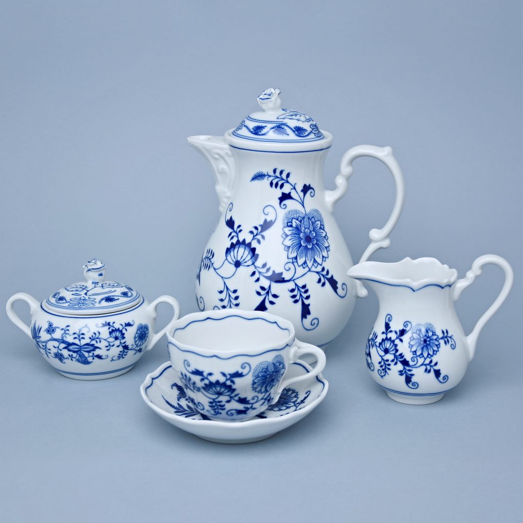 Klasický český cibulový porcelán, kávová souprava: Konvice kávová 1,55 l, mlékovka vysoká 0,25 l, cukřenka s oušky, 6x šálek a podšálek B + B, 210 ml / 14 cm na kávu. Vyrobeno v Dubí, Český porcelán a.s.