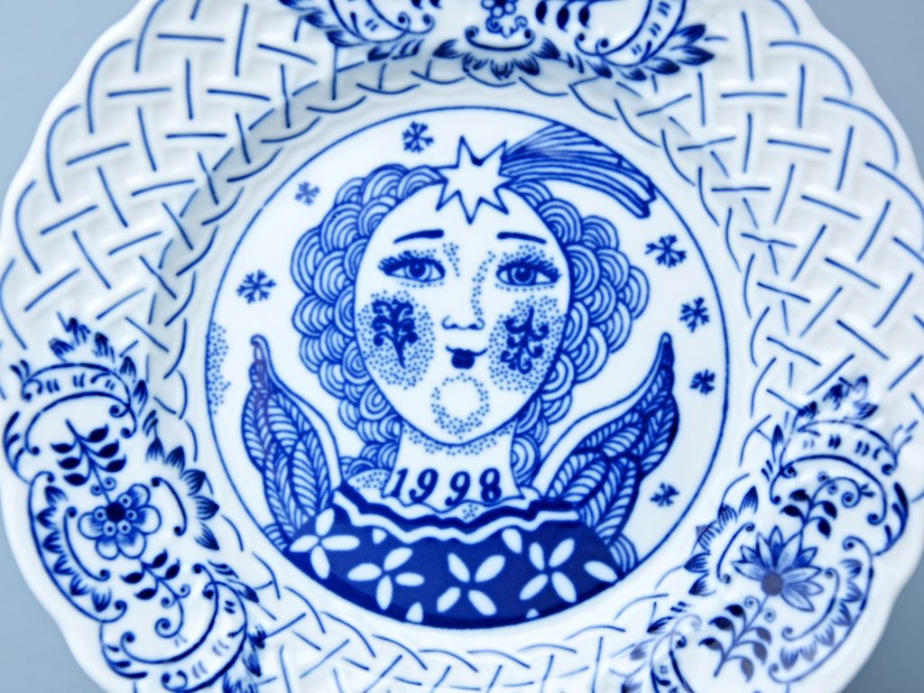 Výroční talíř z roku 1998, 18 cm, reliéfní okraj, závěsný na zeď. Originální modrý cibulový vzor z Dubí, Český porcelán a.s.