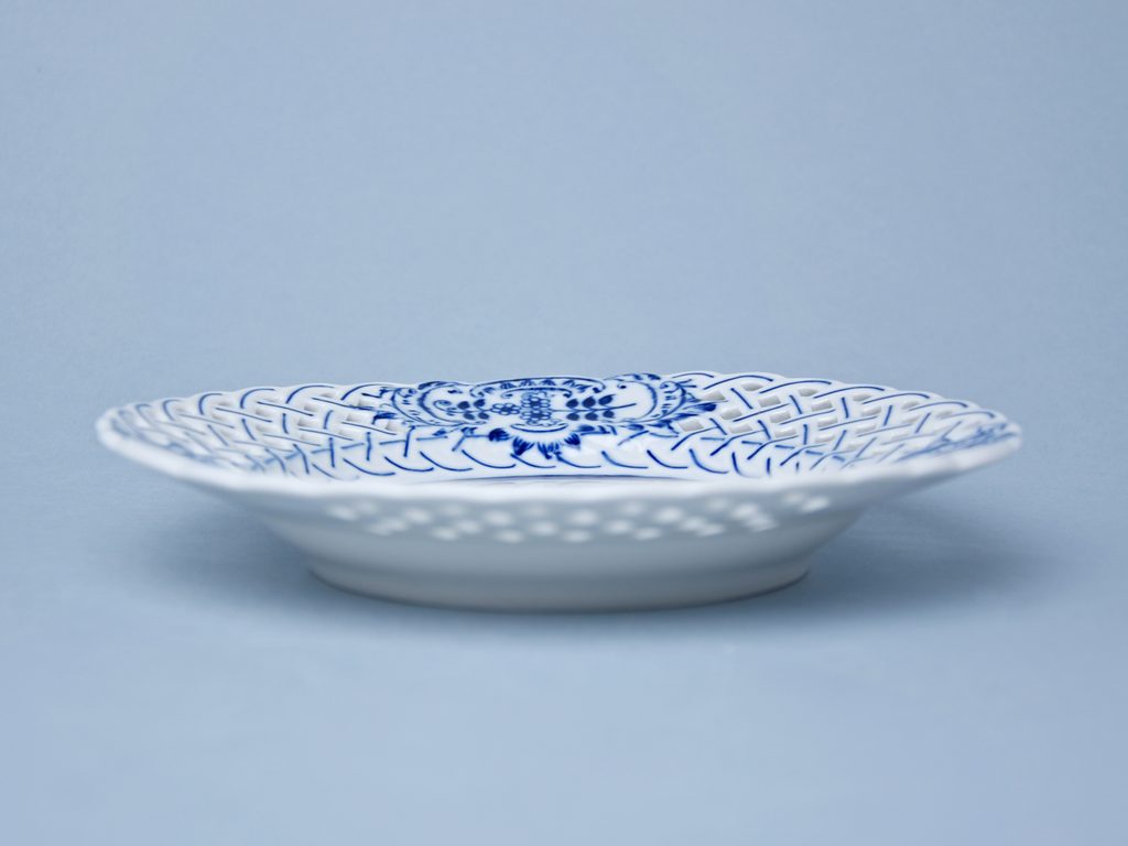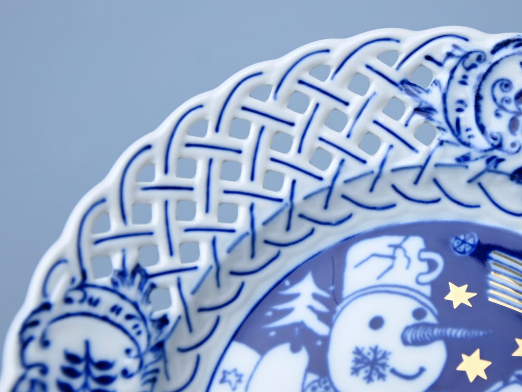 Výroční talíř z roku 2000, 18 cm, perforovaný / prolamovaný okraj, závěsný na zeď. Originální modrý cibulový vzor z Dubí, Český porcelán a.s.