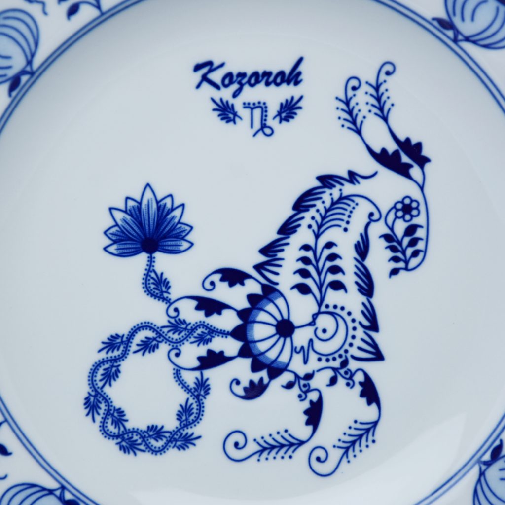 Talíř mělký 24 cm ve znamení zvěrokruhu: Kozoroh (22. 12. - 20. 1.). Zezadu talíře dvě dírky - možno i zavěsit na zeď. Originální Cibulák z Dubí, Český porcelán a.s.