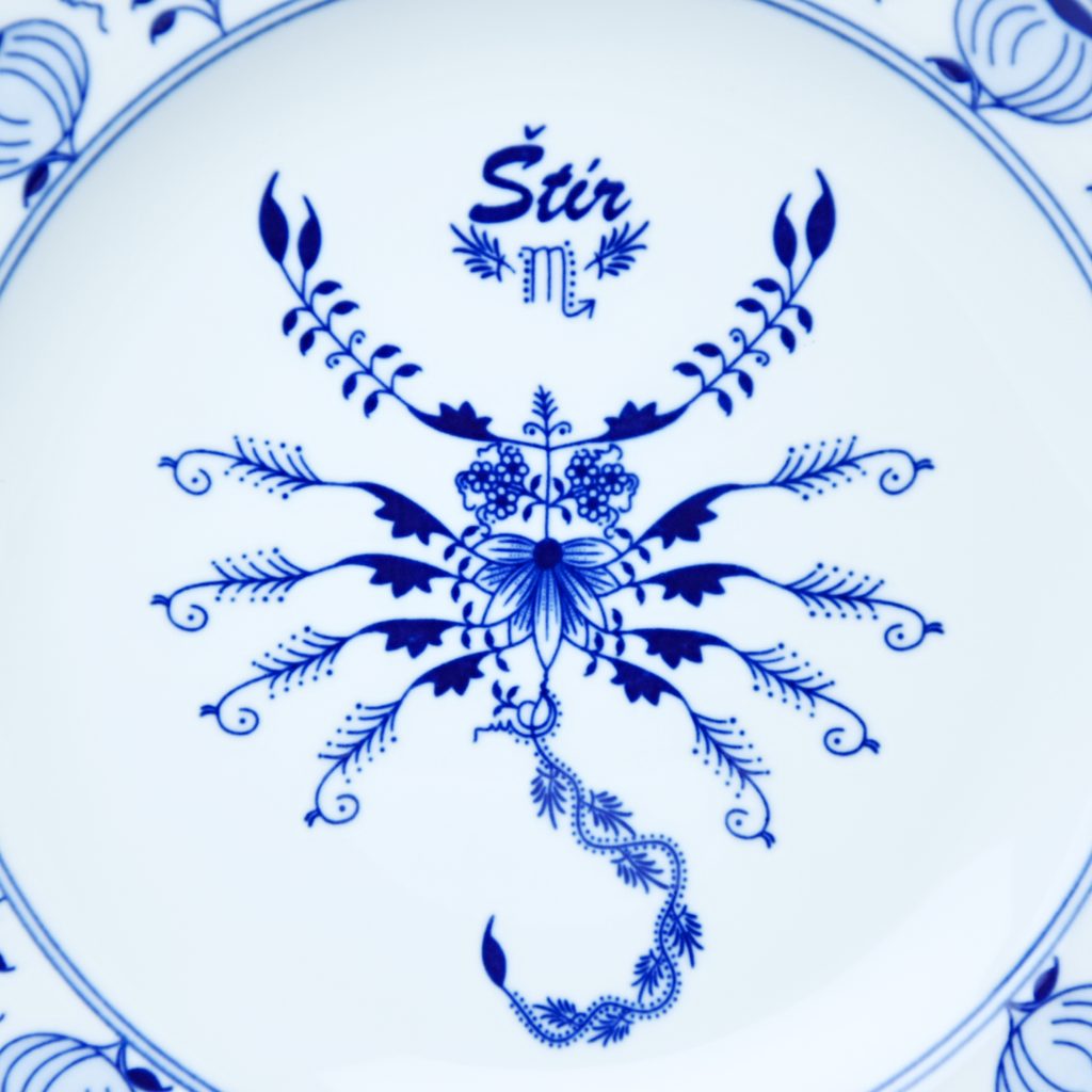 Talíř mělký 24 cm ve znamení zvěrokruhu: Štír (24. 10. - 22. 11.). Zezadu talíře dvě dírky - možno i zavěsit na zeď. Originální Cibulák z Dubí, Český porcelán a.s.