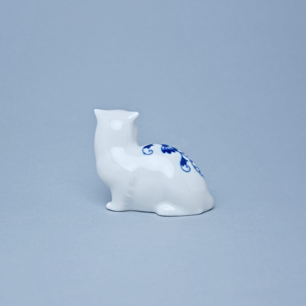 Malá porcelánová figurka sedící kočky. Vyrobeno z kvalitního porcelánu v tradiční české porcelánce Český porcelán a.s. v Dubí, v dekoru originální modrý cibulový vzor.