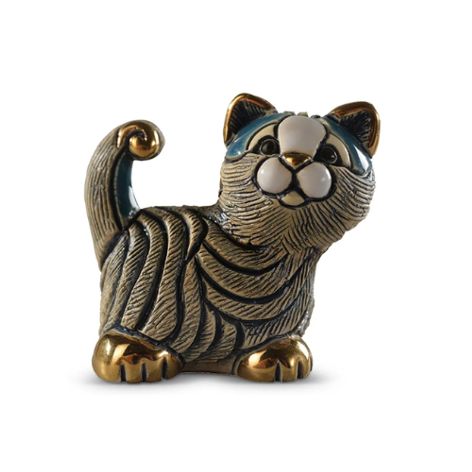 Keramická, ručně vyřezávaná a malovaná figurka kočky v modré barvě od výrobce De Rosa. Každá tvorba sbírek De Rosa Collections je výsledkem jedinečného ručního procesu nejvyšší technické a umělecké kvality. Každá figurka je ručně vyřezávaná a malovaná v Uruguayi. Figurky jsou zvýrazněny platinou, zlatem a zářivými emailovými glazurami.