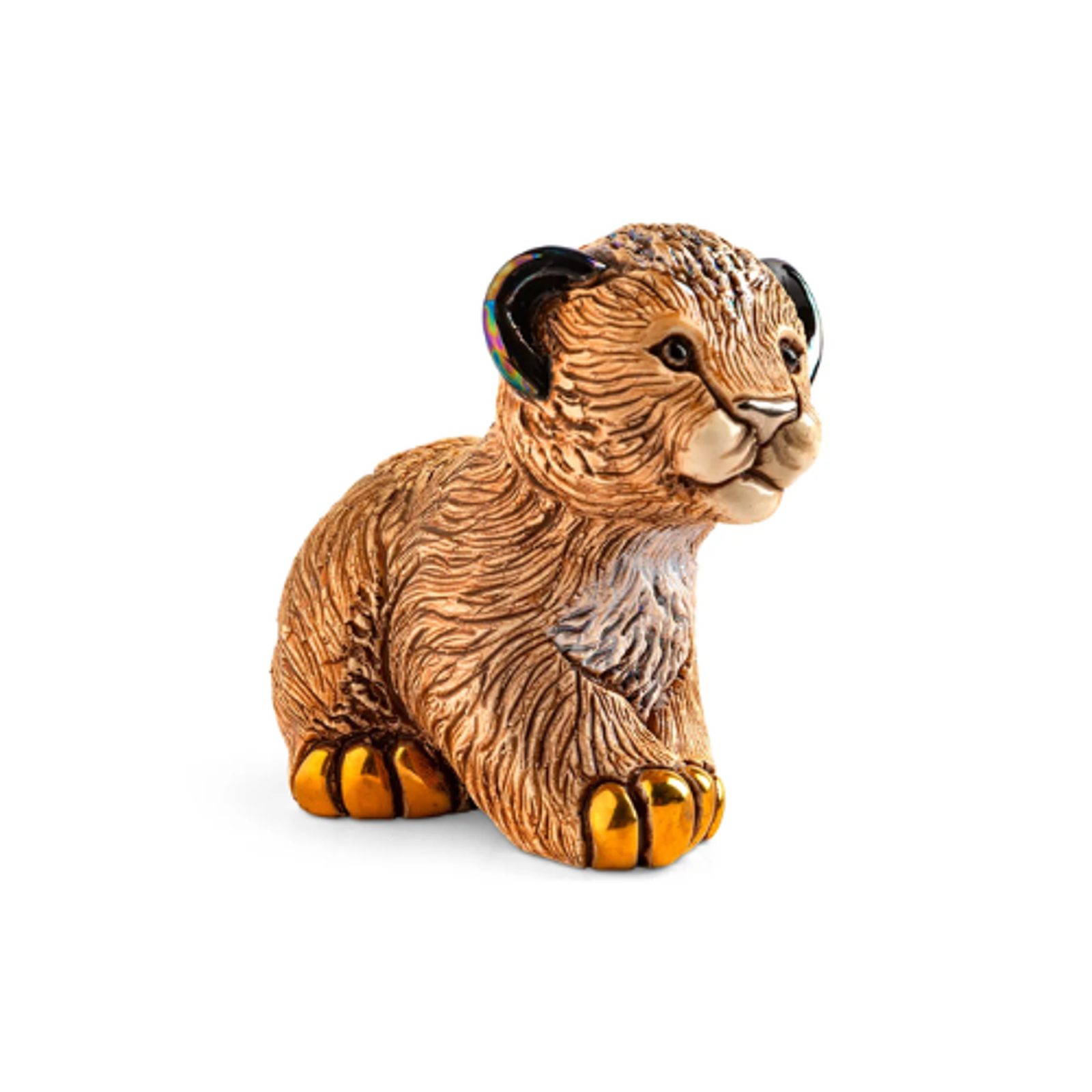 Keramická, ručně vyřezávaná a malovaná figurka lvíčete v béžové barvě od výrobce De Rosa. Každá tvorba sbírek De Rosa Collections je výsledkem jedinečného ručního procesu nejvyšší technické a umělecké kvality. Každá figurka je ručně vyřezávaná a malovaná v Uruguayi. Figurky jsou zvýrazněny platinou, zlatem a zářivými emailovými glazurami.