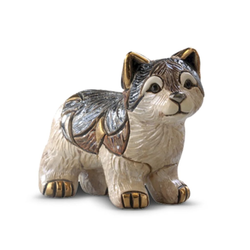 Keramická, ručně vyřezávaná a malovaná figurka mláděte vlka v béžové barvě od výrobce De Rosa. Každá tvorba sbírek De Rosa Collections je výsledkem jedinečného ručního procesu nejvyšší technické a umělecké kvality. Každá figurka je ručně vyřezávaná a malovaná v Uruguayi. Figurky jsou zvýrazněny platinou, zlatem a zářivými emailovými glazurami.