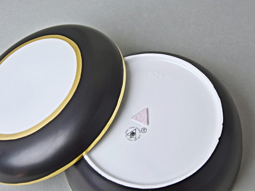 Elegantní černá kulatá dóza se zlatou linkou. Lze využít na šperky, či jiné drobnosti. Vyrobeno v české manufaktuře Duchcov (Royal Dux Bohemia).