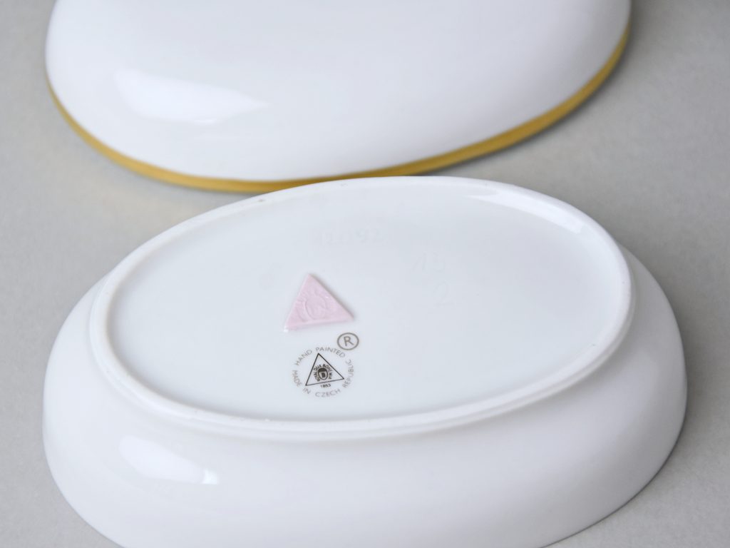 Elegantní bílá oválná dóza se zlatou linkou. Lze využít na šperky, či jiné drobnosti. Vyrobeno v české manufaktuře Duchcov (Royal Dux Bohemia).