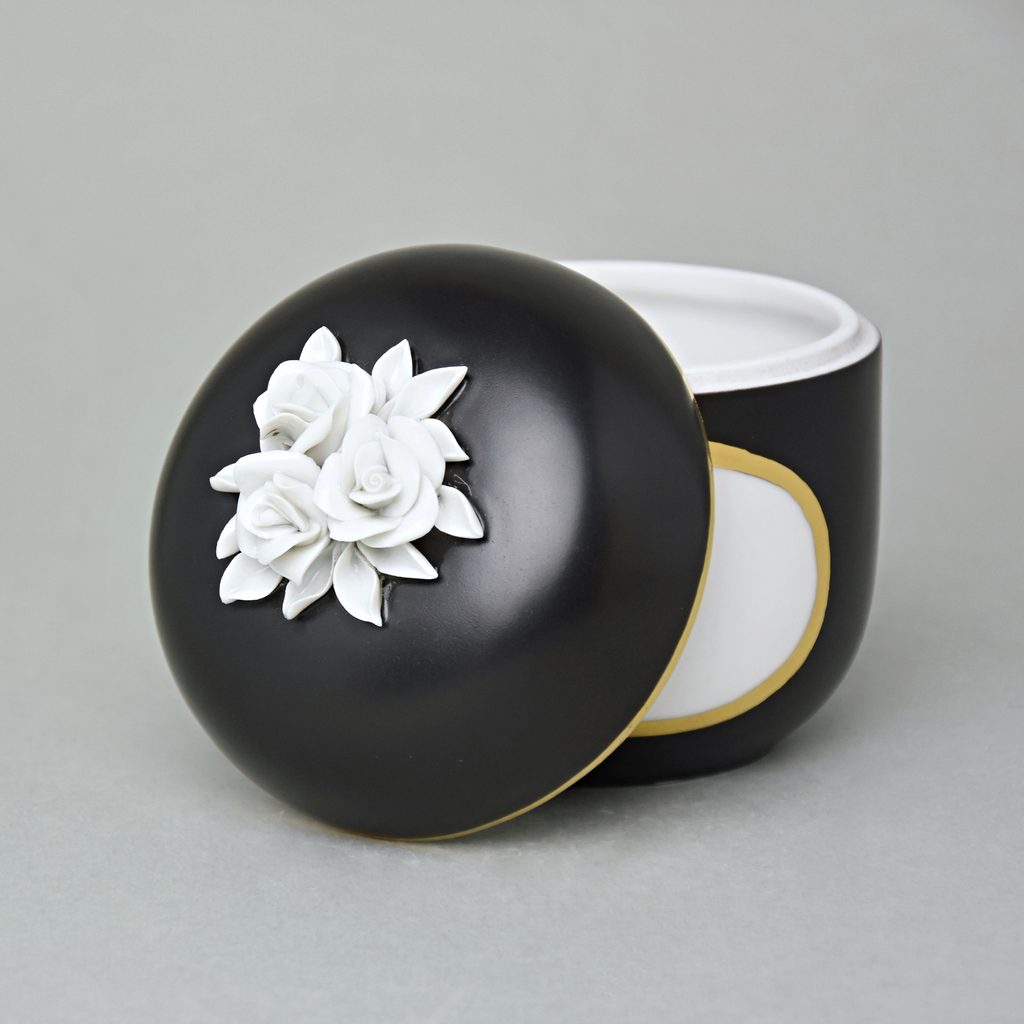 Dóza s bílými růžemi 11 x 9 cm + okénko pro nápis, Černý fond + zlato, Porcelán Duchcov