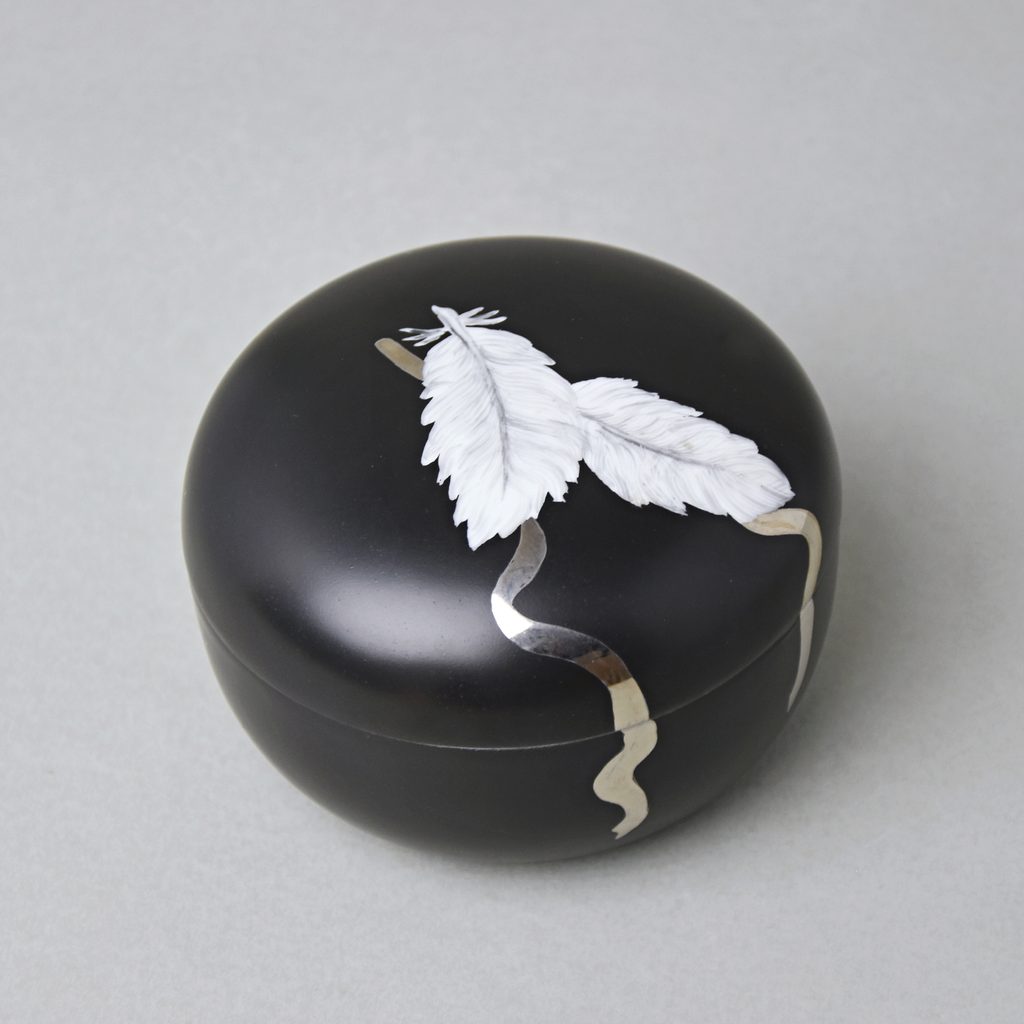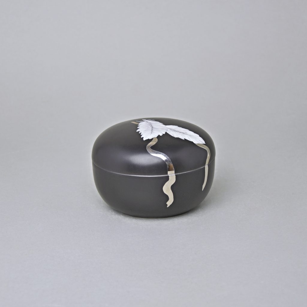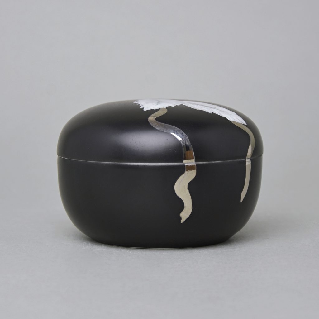 Dóza s pírky a platinovou stuhou, nízká, 7 x 10,3 cm, Černý fond + Platina, Porcelán Duchcov