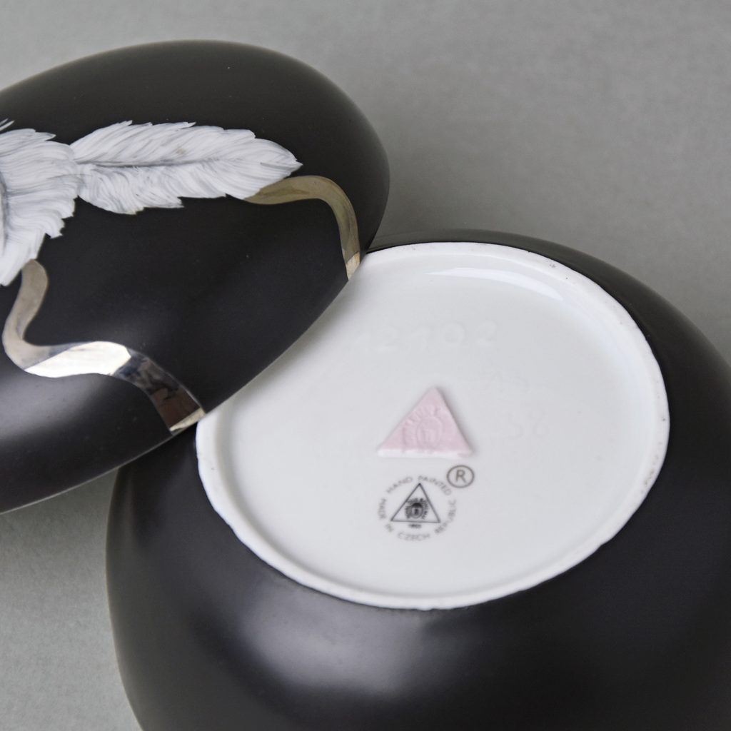Elegantní černá kulatá dóza s peříčky a platinovou stuhou na víčku. Lze využít na šperky, či jiné drobnosti nebo jako malá urna na domácího zesnulého mazlíčka. Vyrobeno v české manufaktuře Duchcov (Royal Dux Bohemia).