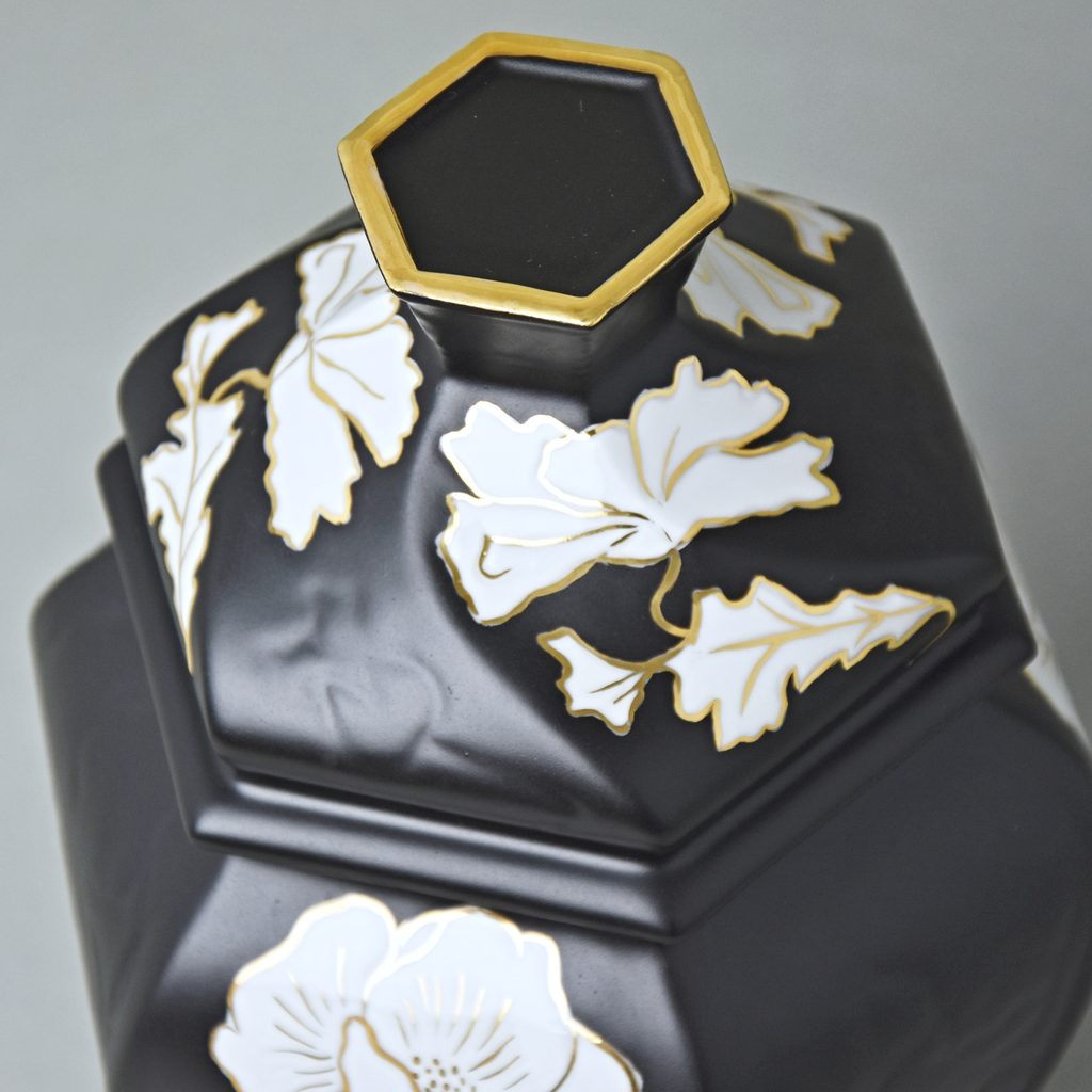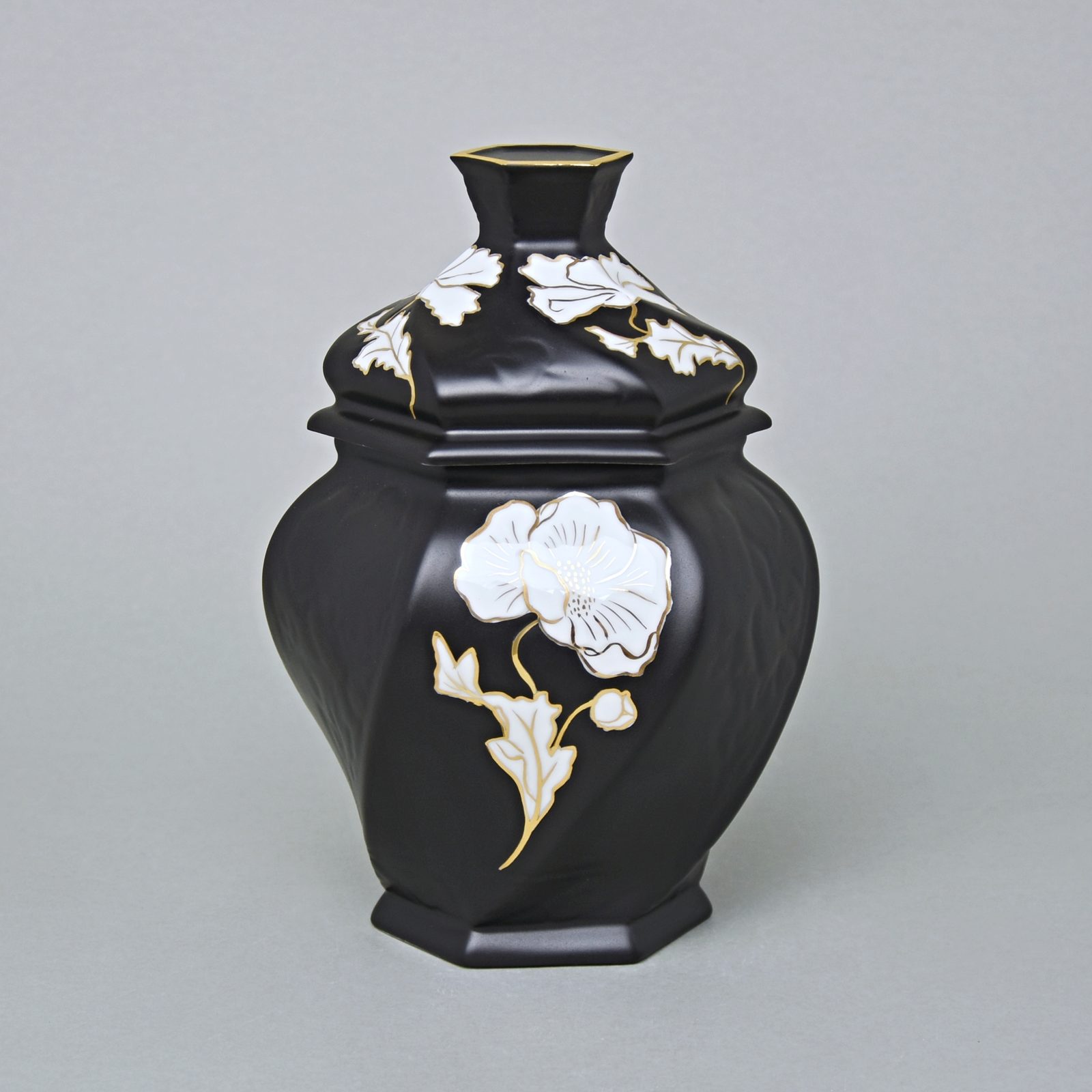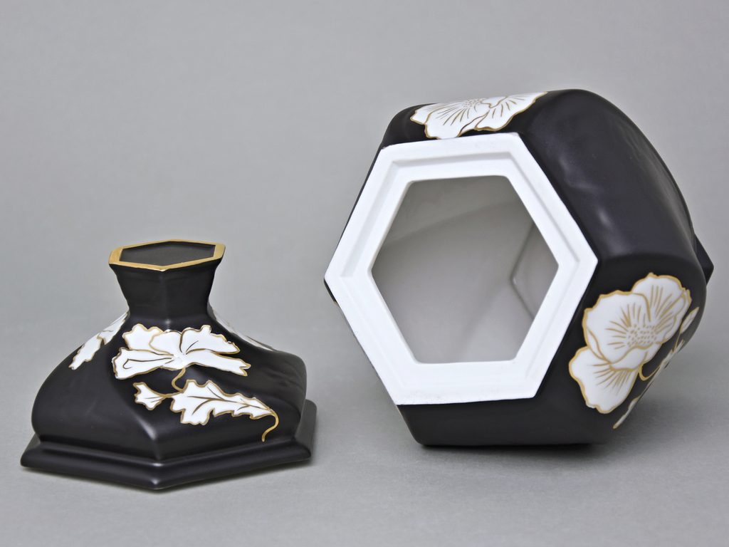 Elegantní černá šestihranná dóza / urna s květinami a bohatě zdobena zlatem. Lze využít na uchování tajností nebo jako menší urna na psa či jiného domácího mazlíčka. Vyrobeno v české manufaktuře Duchcov (Royal Dux Bohemia).