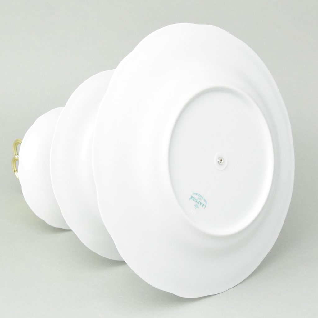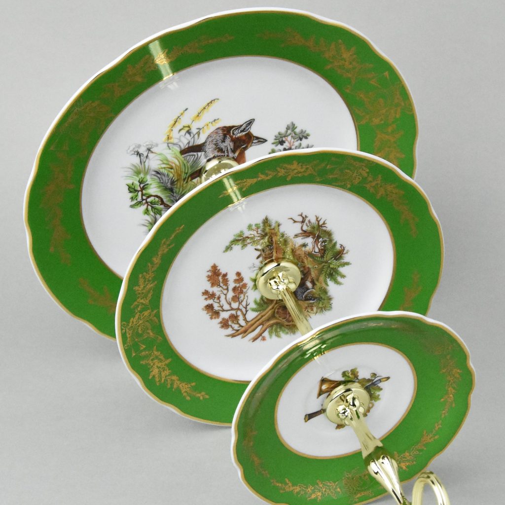 Myslivecký etažer na cukroví s kovovou tyčkou tvar Mary Ann od výrobce Leander Loučky. Pokaždé jiný náhodný dekor zvěře (bažanti, zajíc, srnka, jelen, liška, tetřev), bohaté zlaté zdobení. Talíř 25 cm, talíř 19 cm, podšálek 15 cm.