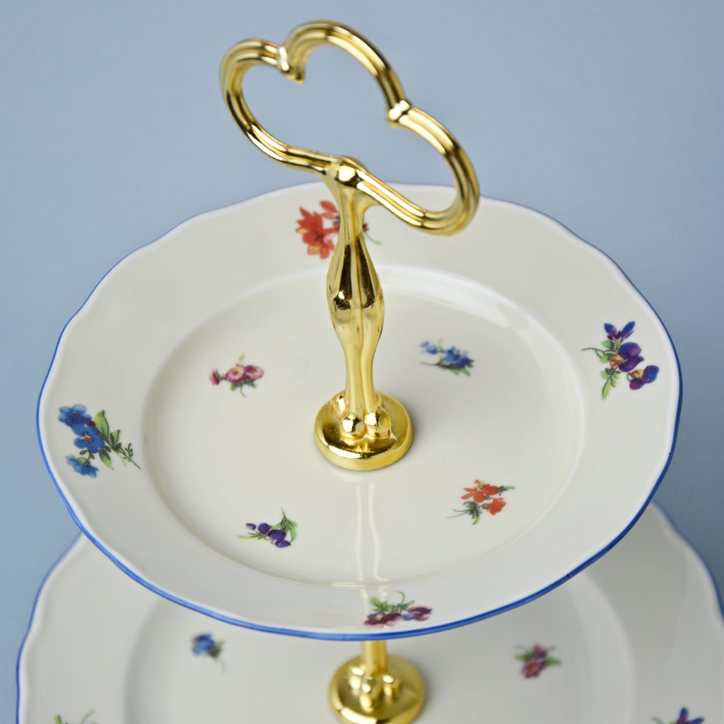 Talíře 15 + 19 + 24 cm, pevná ocelová zlacená tyčka, dekor házenka na slonové kosti s modrou linkou. Český porcelán a.s.