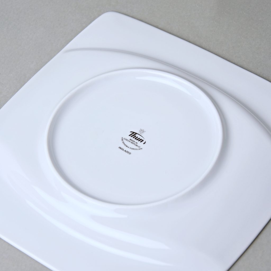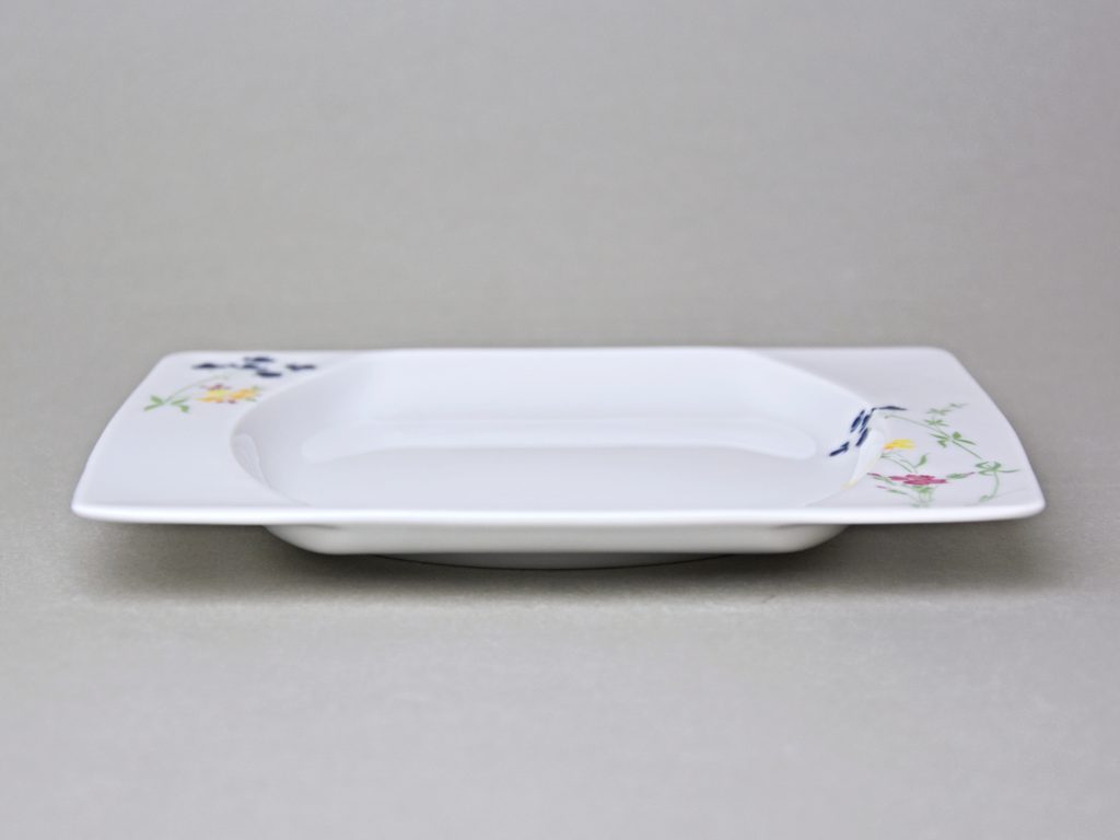 Atypický tvar kolekce - čtvercové talíře s oválným výřezem jídelní plochy. Masivnější porcelán větší hmotnosti.