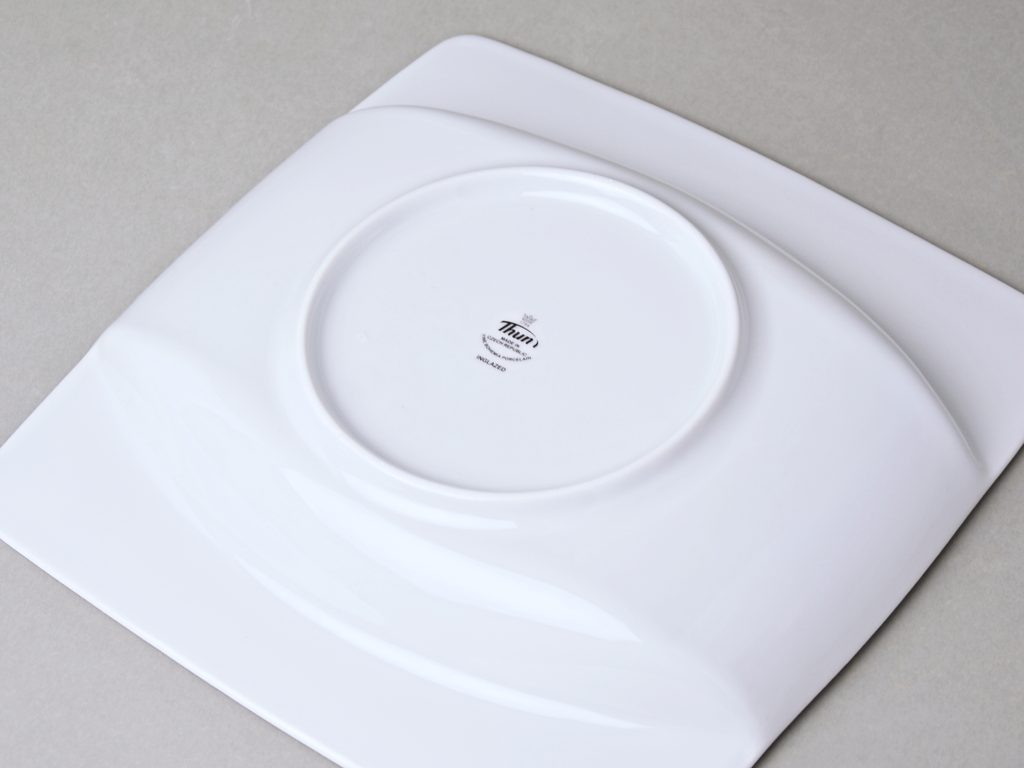 Atypický tvar kolekce - čtvercové talíře s oválným výřezem jídelní plochy. Masivnější porcelán větší hmotnosti.