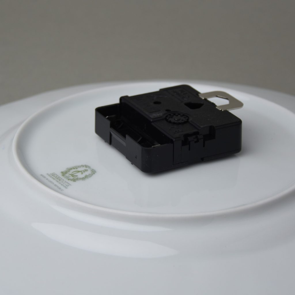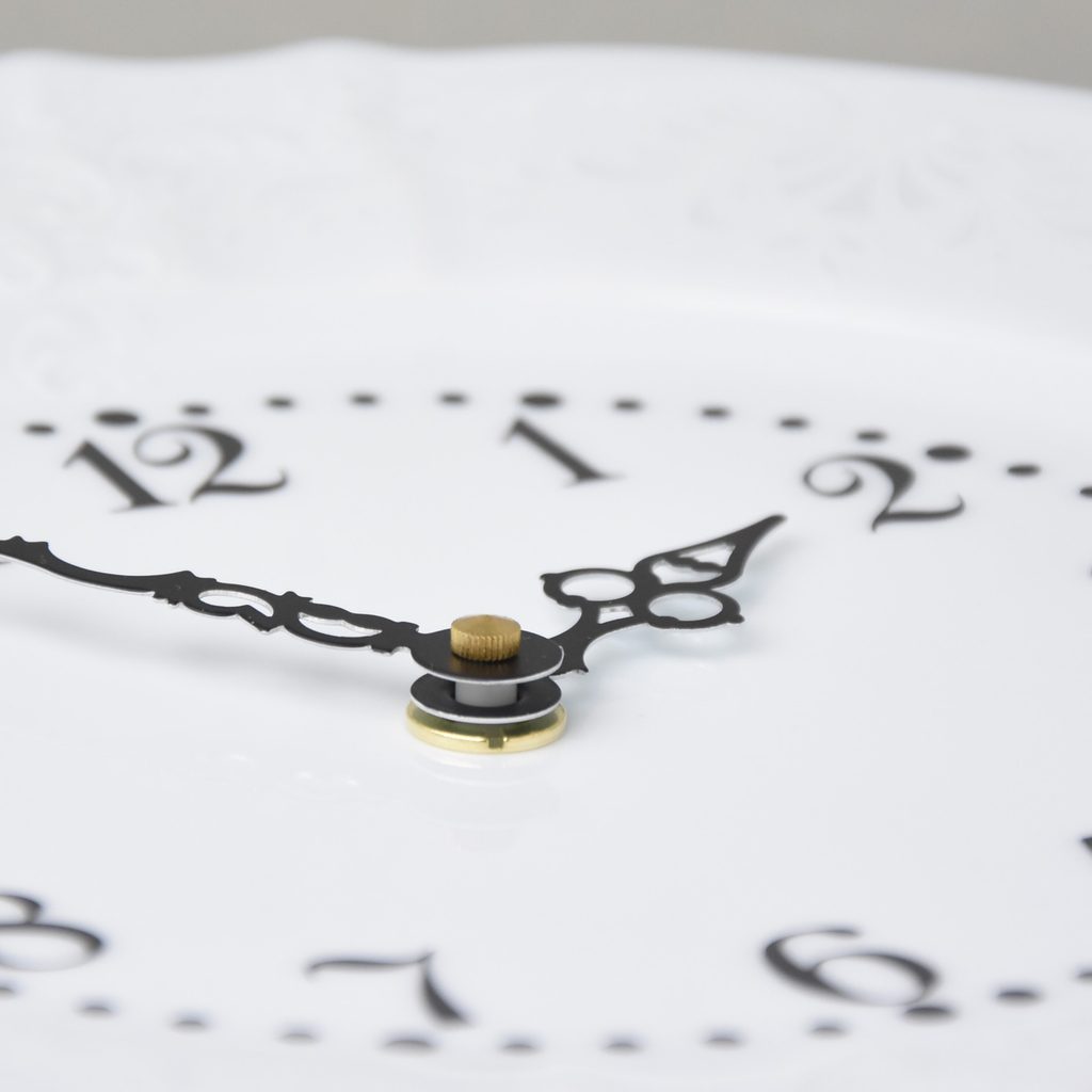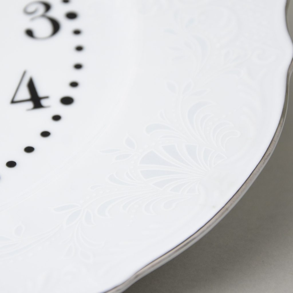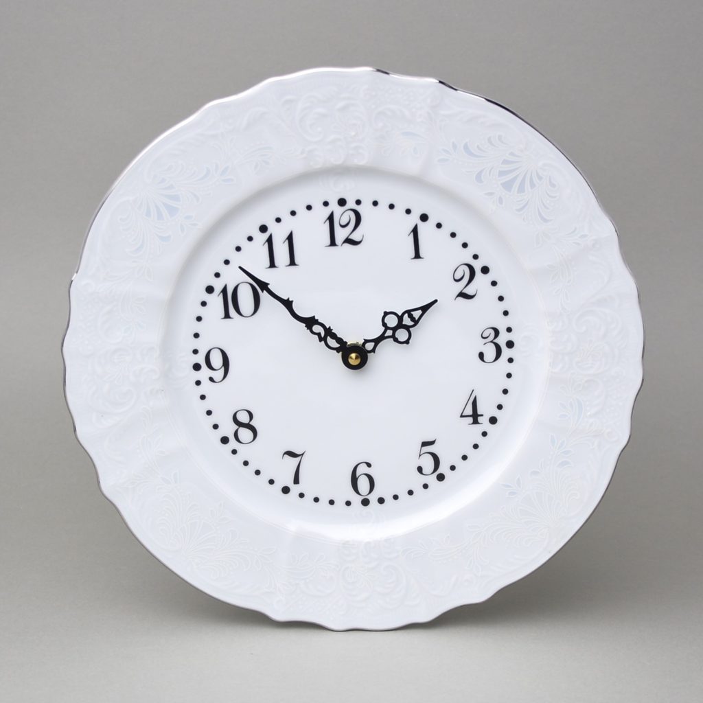 Se strojkem, tichým, na baterii AA (není v balení), porcelán Bernadotte, dekor "Mráz", nenápadný střibrný dekor připomínající zamrzlé okno + platinová linka