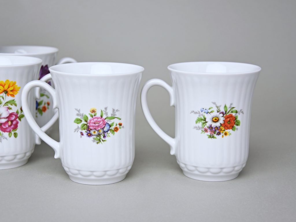 Oblíbený dekor pestrobarevných květů  na vysokém zdobném (10,2 cm) hrnku Derby o objemu 250 ml, šest náhodných dekorů pestrých květů