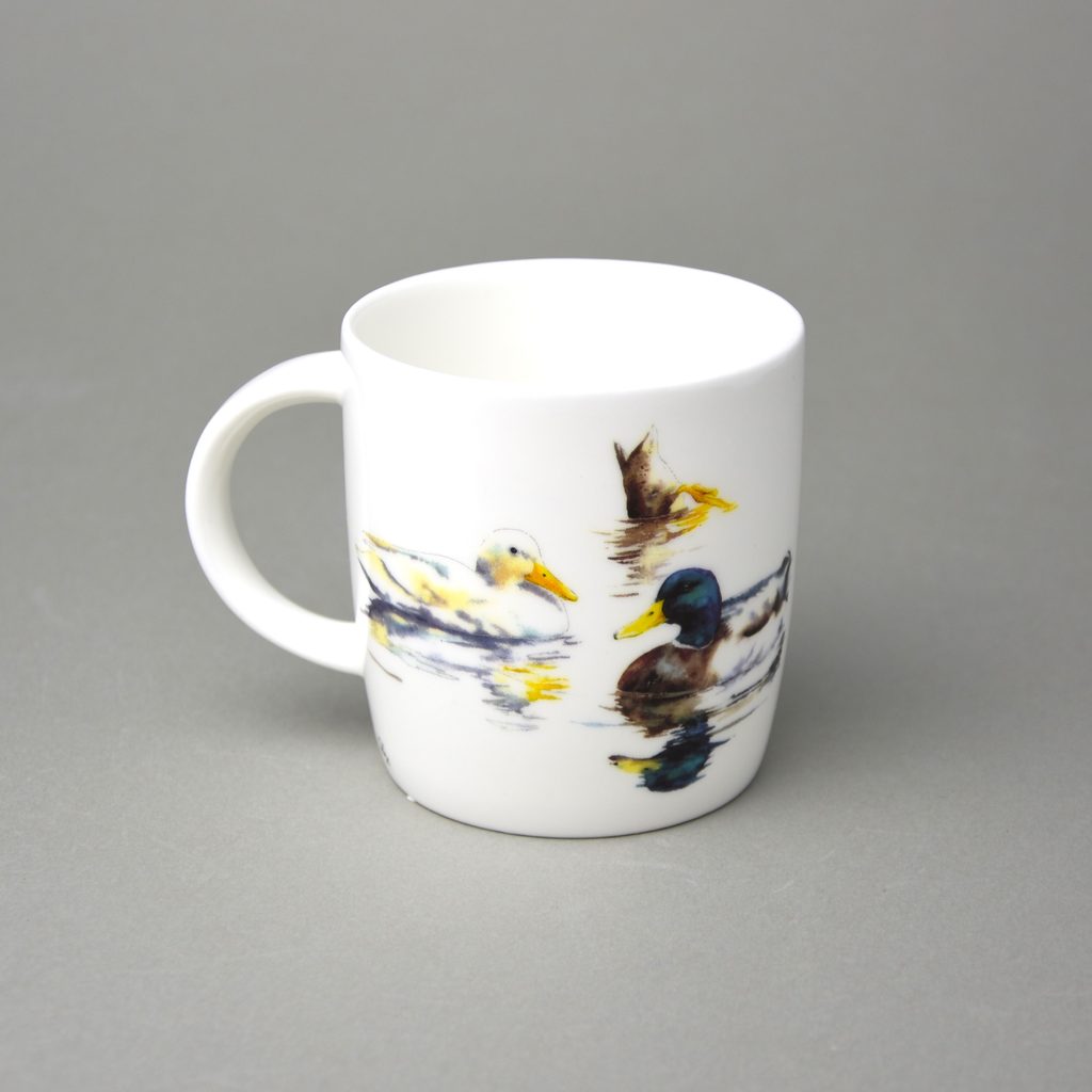 v. 9 cm, š. 8,5 cm, úžasný divoký vodní kachní život na hrnku z kostního porcelánu Roy Kirkham, skvělý úchop