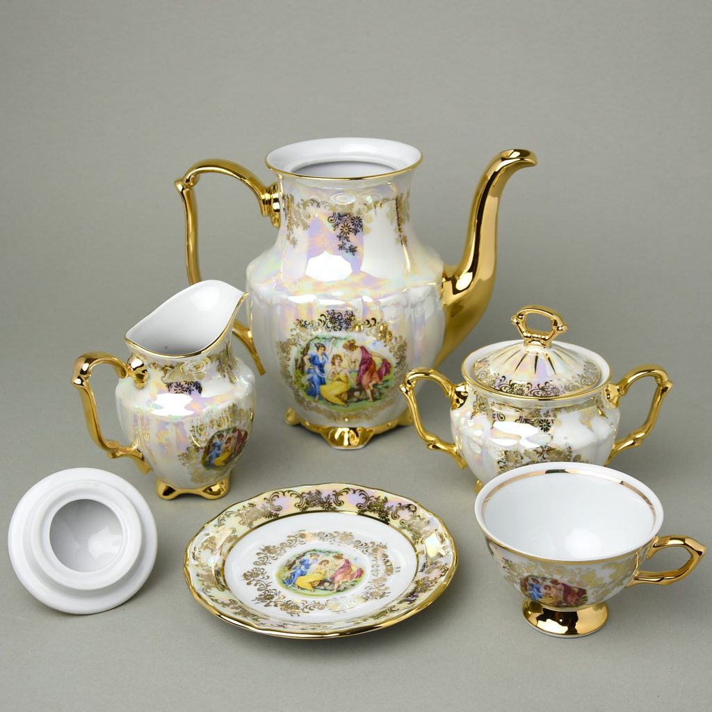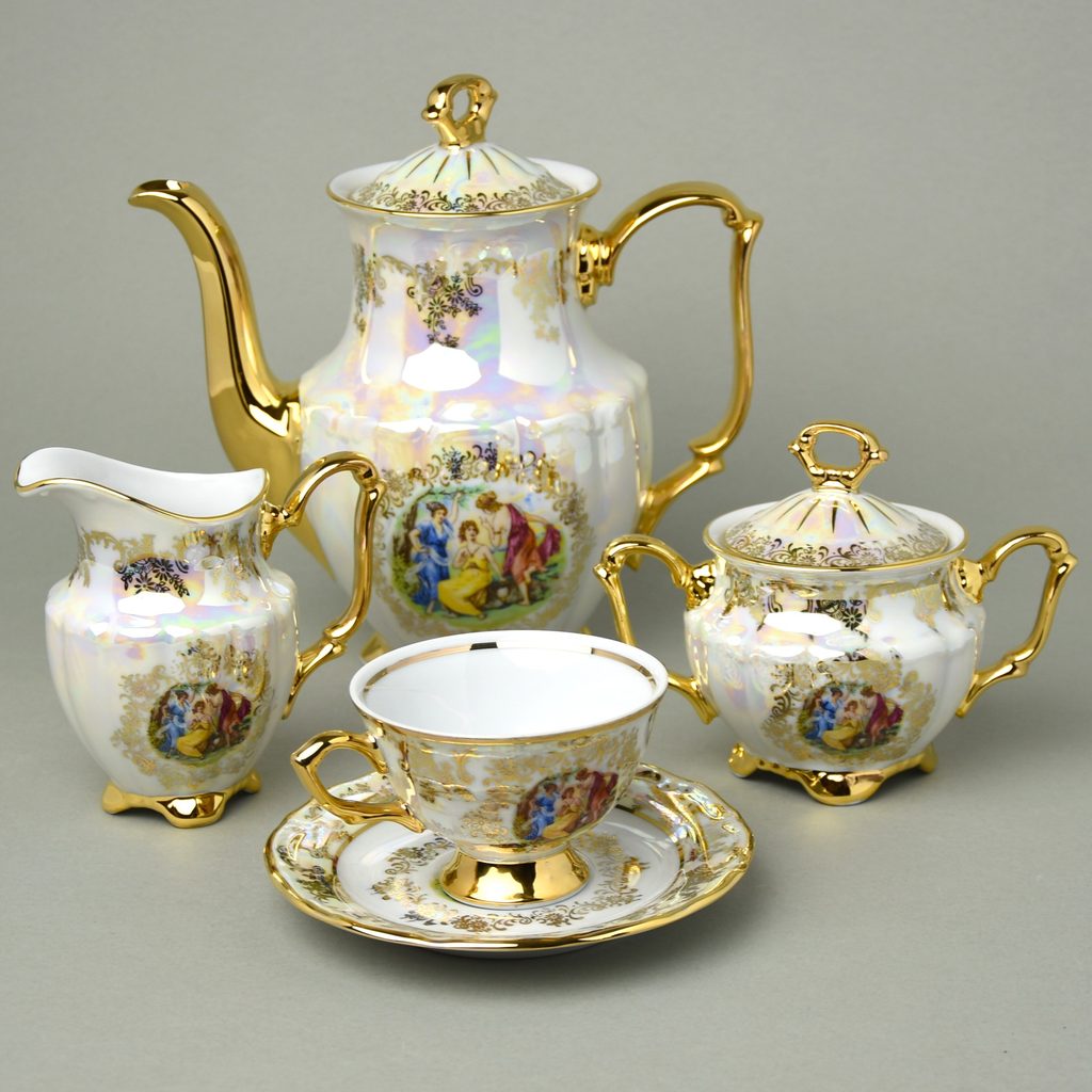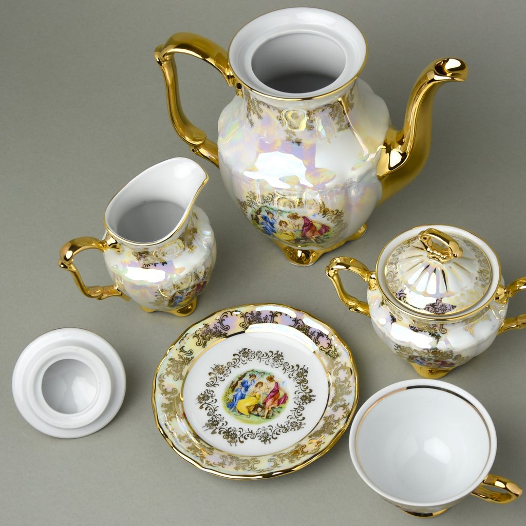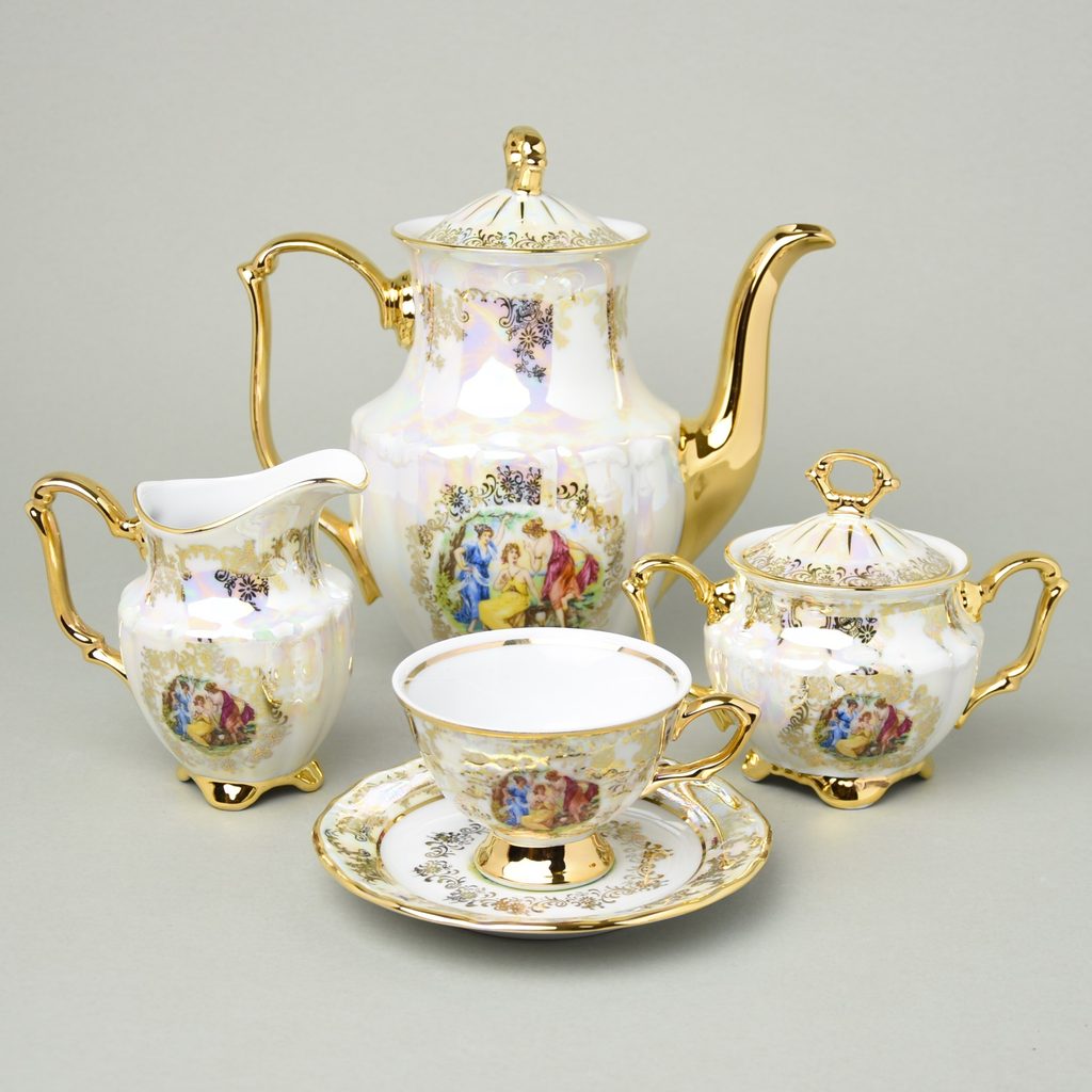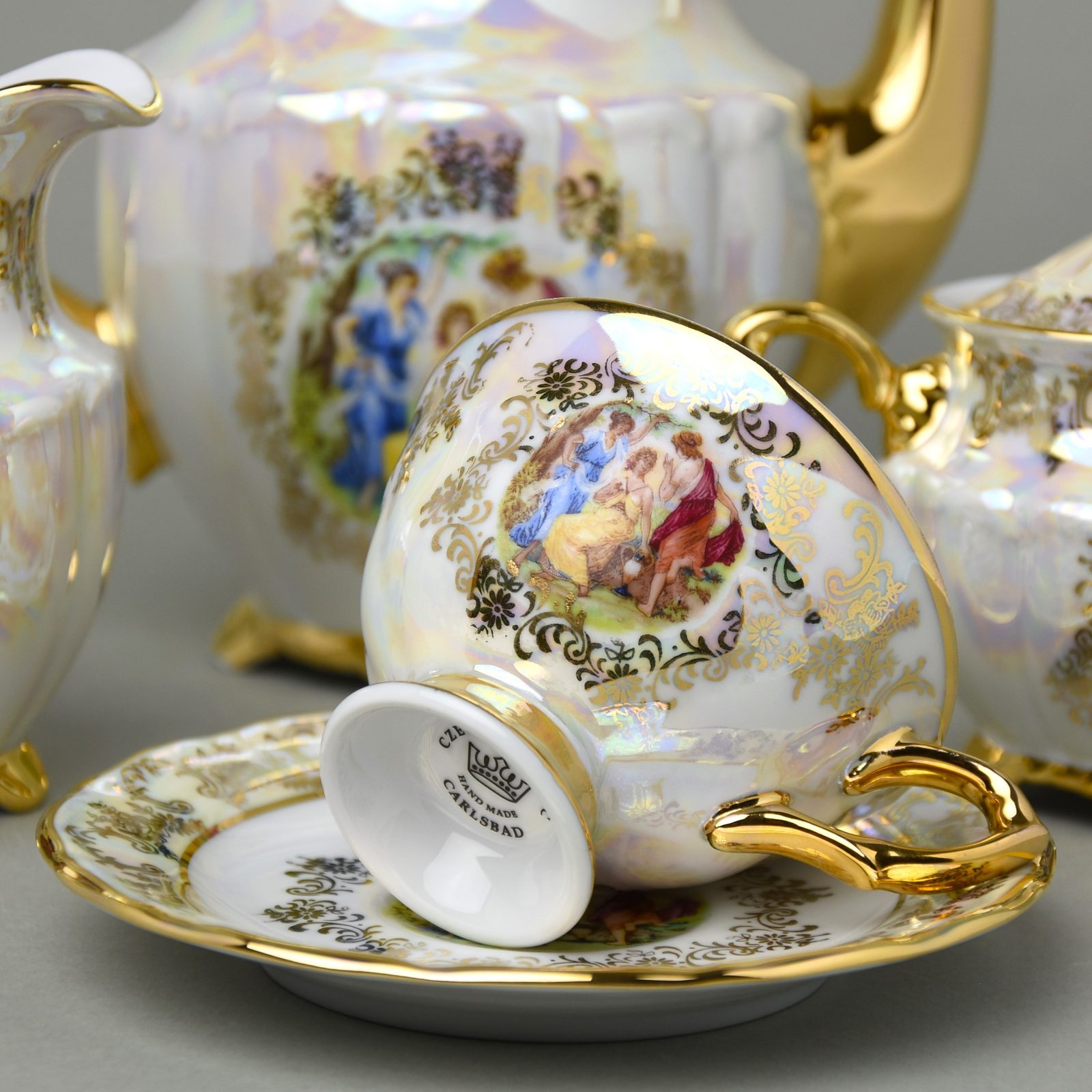 Velmi vznešená zdobná kávová souprava pro 6 osob. Tři Grácie, zlatý listr,  Carlsbad. Výrazné zlaté zdobení. Vhodné pro slavnostní události i běžné užití.