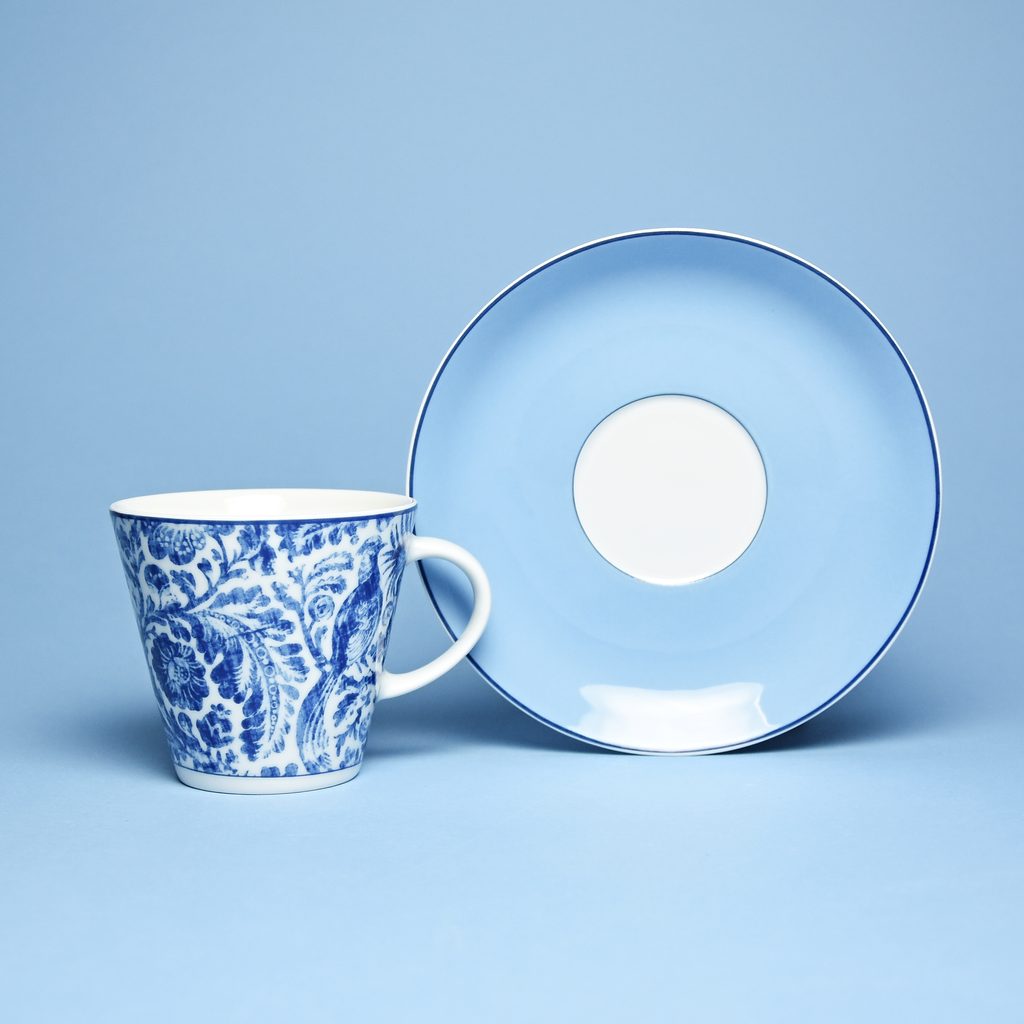 1x šálek a podšálek 150 ml, konev kávová 1,2 l, cukřenka a mlékovka - malá sada pro 1 osobu, pěkný modrý ptačí dekor č. 30041 na tvaru TOM z Thunu
