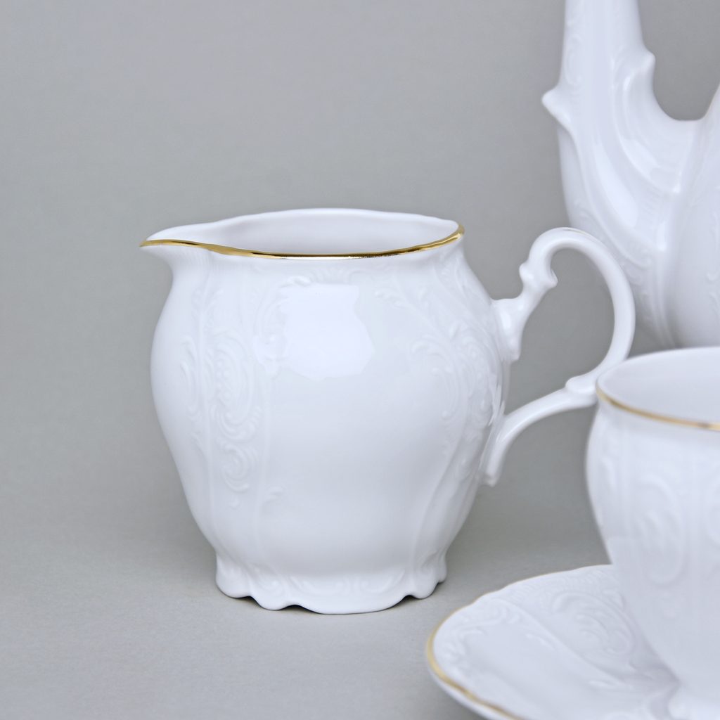 Obsahuje: 6x šálek KÁVOVÝ 150 ml, 6x podšálek 14 cm, 1x konvice kávová 1,2 l, 1x cukřenka 300 ml, 1x mlékovka 250 ml, tvar Bernadotte z lesovské porcelánky, dekorace tenkou zlatou linkou