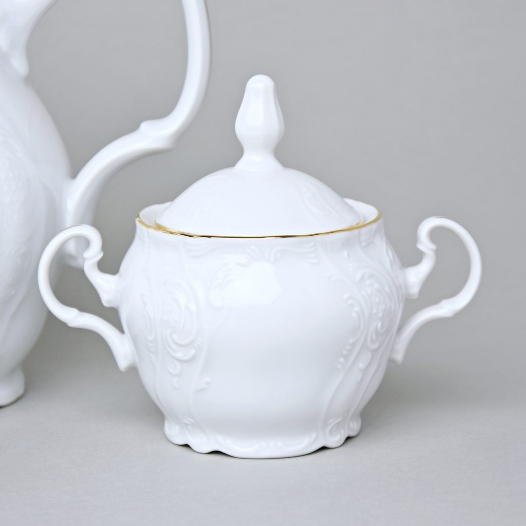Kávová sada pro 6 osob oblíbeného tradičního tvaru Benadotte s dekorem zlaté linky, Thun 1794.