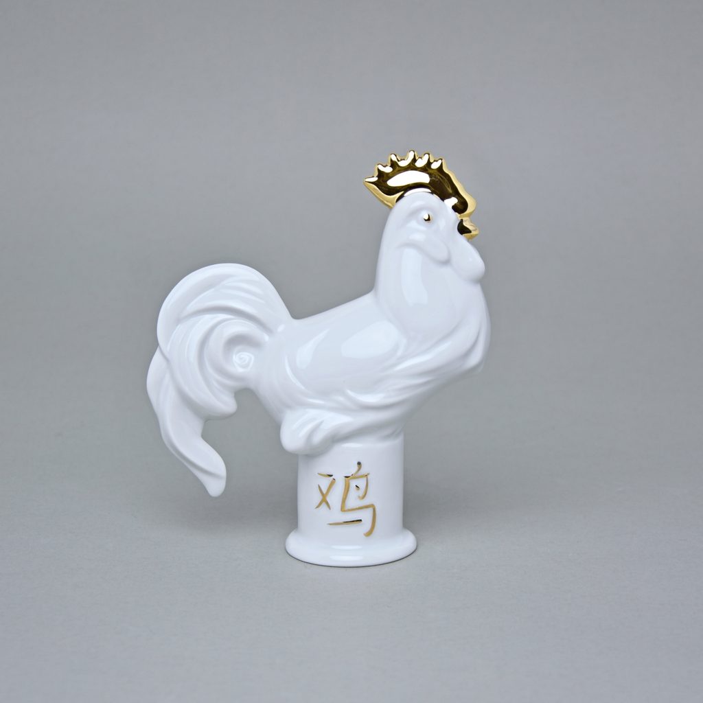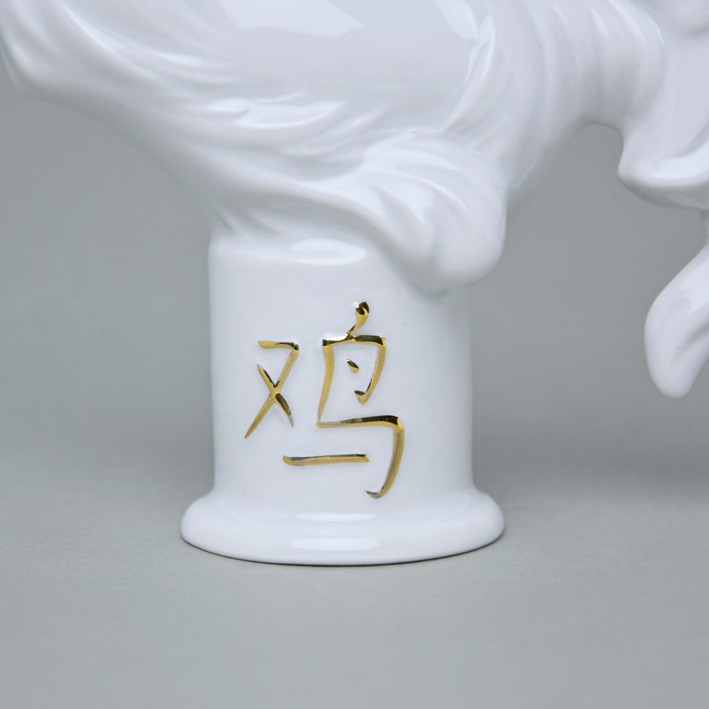 Porcelánová figurka kohouta. Nadčasový moderní design v čistě bílé barvě a zlacenými detaily. Vyrobeno v tradiční české manufaktuře Duchcov (Royal Dux Bohemia), dnes bohužel již zaniklé. Na podstavci zlatý čínský nápis "Kohout".
