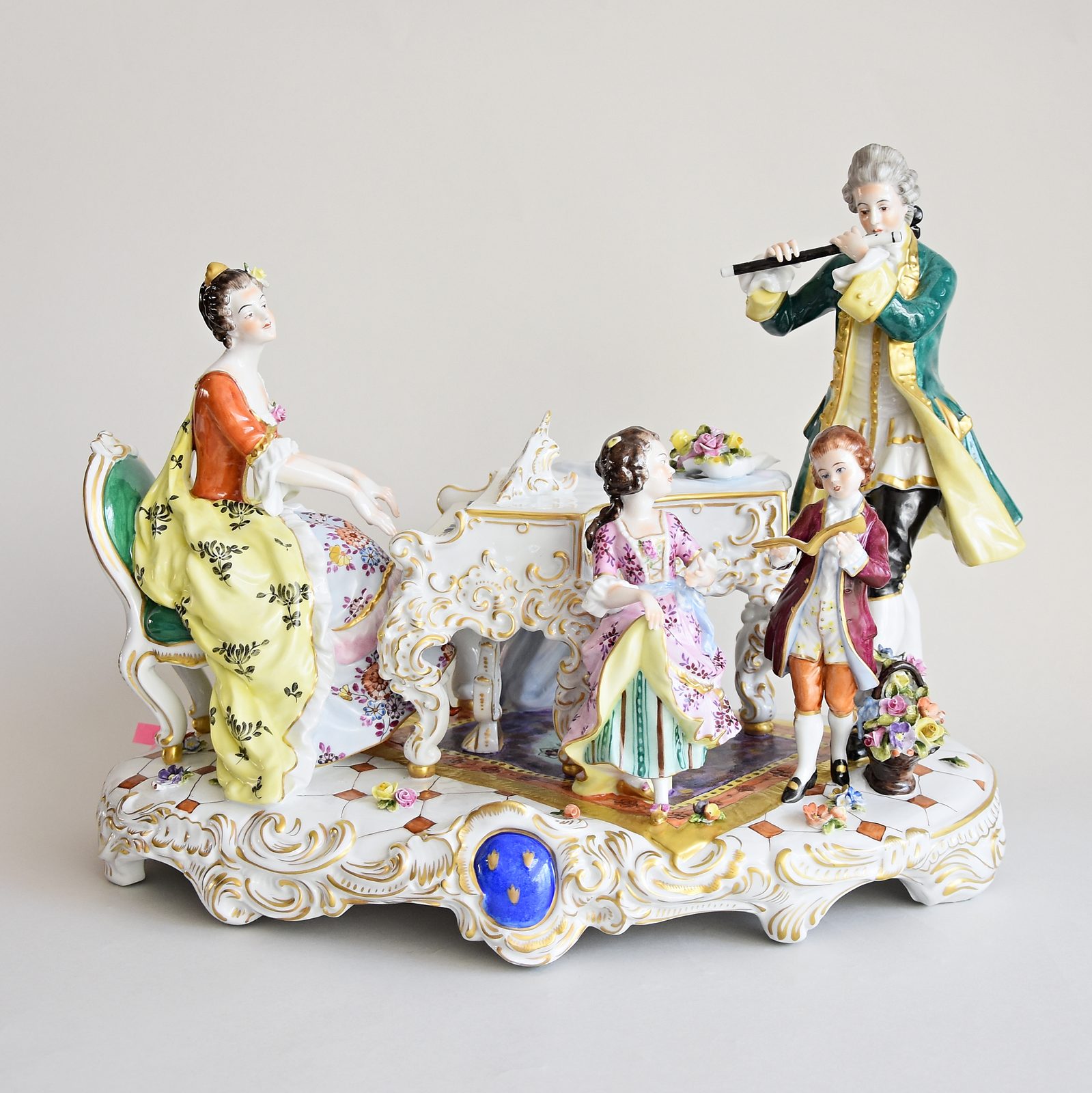 Velká luxusní porcelánová figura koncertní skupiny - žena hrající na klavír, muž s flétnou a dvě zpívající děti.
