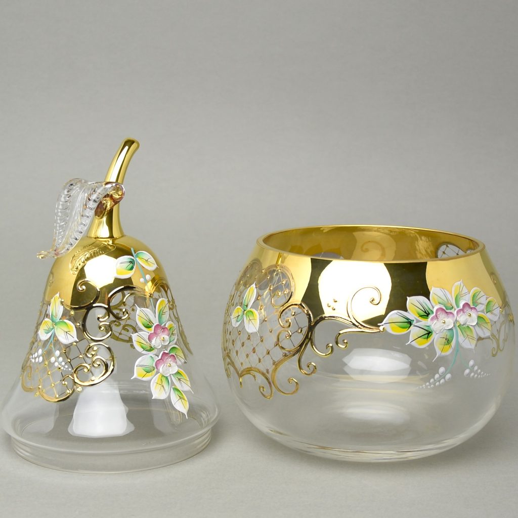 Křišťálová dóza "Hruška" kulatá, v. 28 cm velká, zlato + smalt, Bohemia