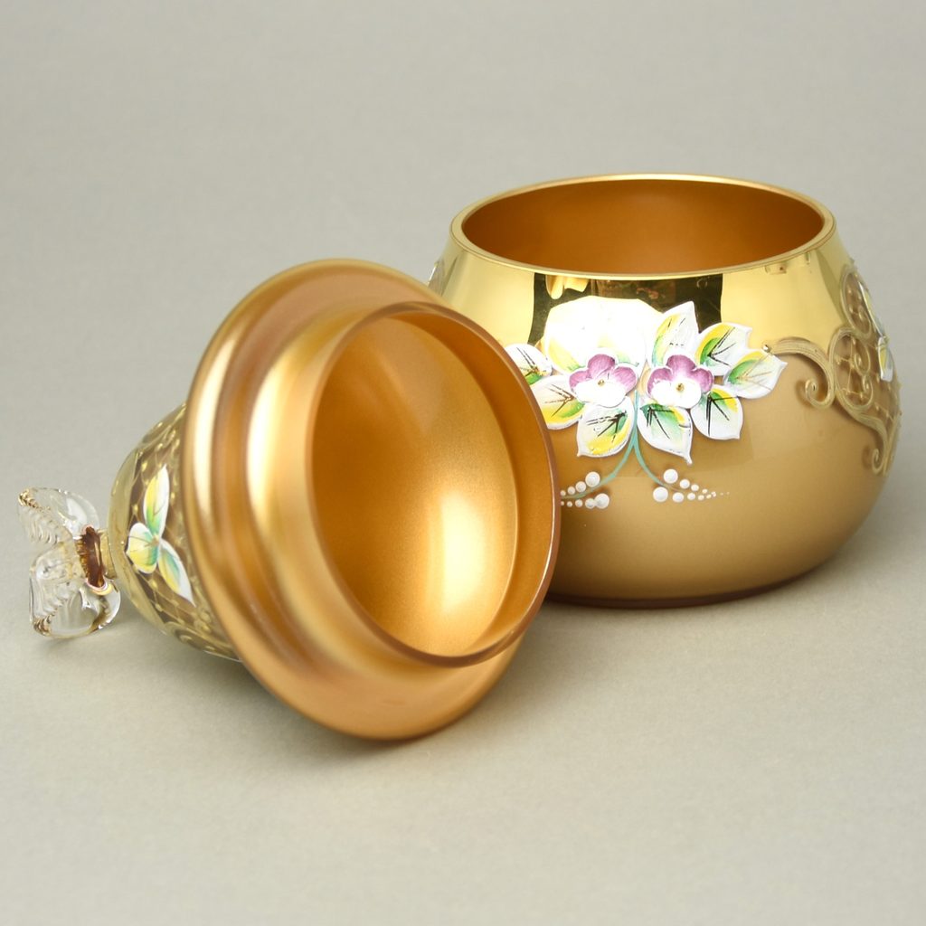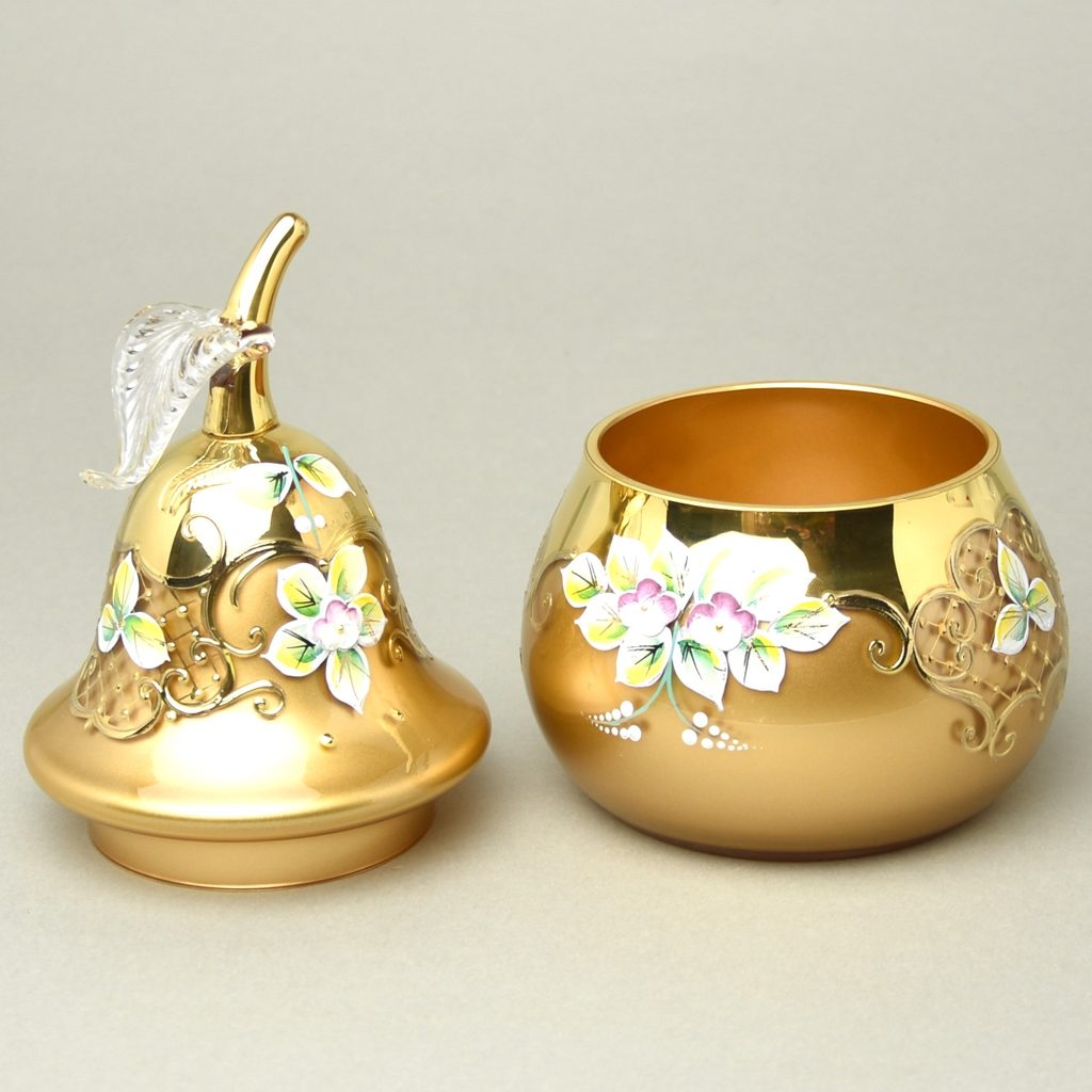 Křišťálová dóza "Hruška" kulatá ZLATÁ, v. 20,5 cm, zlato + smalt, Jahami Bohemia